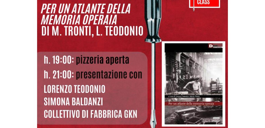 BARBERINO DI MUGELLO – Venerdì 15 Marzo, presso la Casa del Popolo di Barberino di Mugello, si terrà la presentrazione del libro “Per un atlante della memoria operaia”, di M. Tronti e M. Teodonio. Spiegano gli organizzatori che la pizzeria apriràò alle 19.00, e che alle 21.00 si terrà la presentazioje, con la partecipazione di Lorenzo Teodonio, Simona Baldanzi e di una rappresentanza del collettivo di fabbrica Gkn.