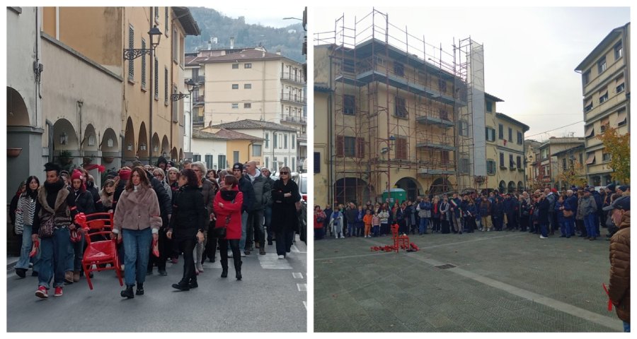 Dopo il ritrovo davanti al Municipio, il corteo si è recato fino a piazza Buonamici dove è stata installata una “sedia rossa antiviolenza”.