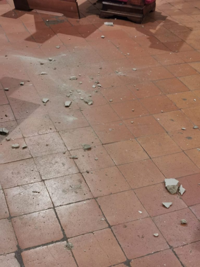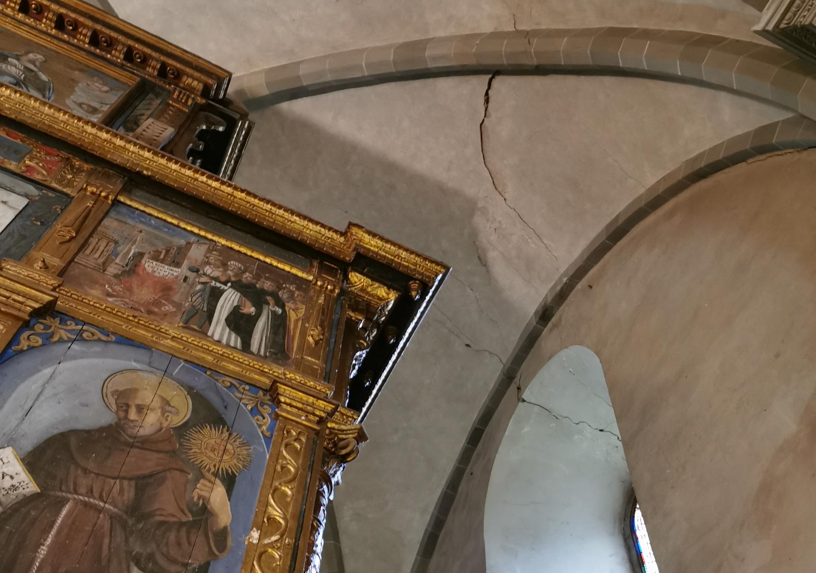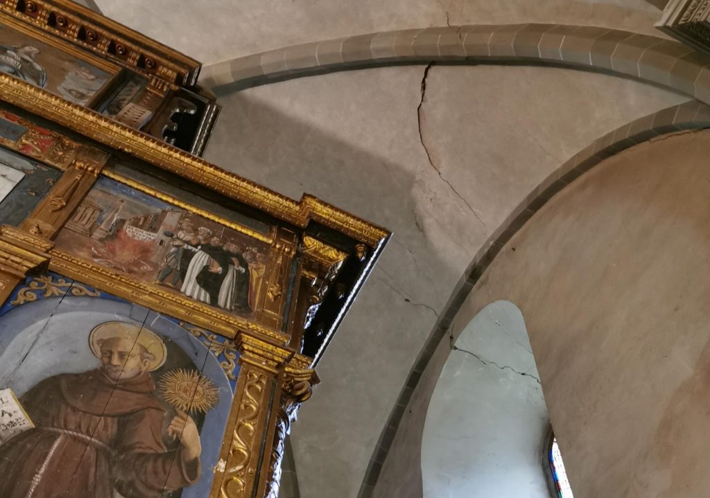 Ma i danni più dolorosi si registrano nell’antica e preziosa chiesa del convento di San Bonaventura al Bosco ai Frati, e le immagini di Francesco Noferini documentano queste ferite. Si sono staccate parti dell’intonaco della volta sopra l’altare e anche nell’abside. Due lesioni rilevanti sulla volta sopra l’altare destano seria preoccupazione. Sono attesi i Vigili del Fuoco per le verifiche. Mentre la parte conventuale e gli spazi museali non hanno riportato alcun danno, e le opere d’arte sono in sicurezza.