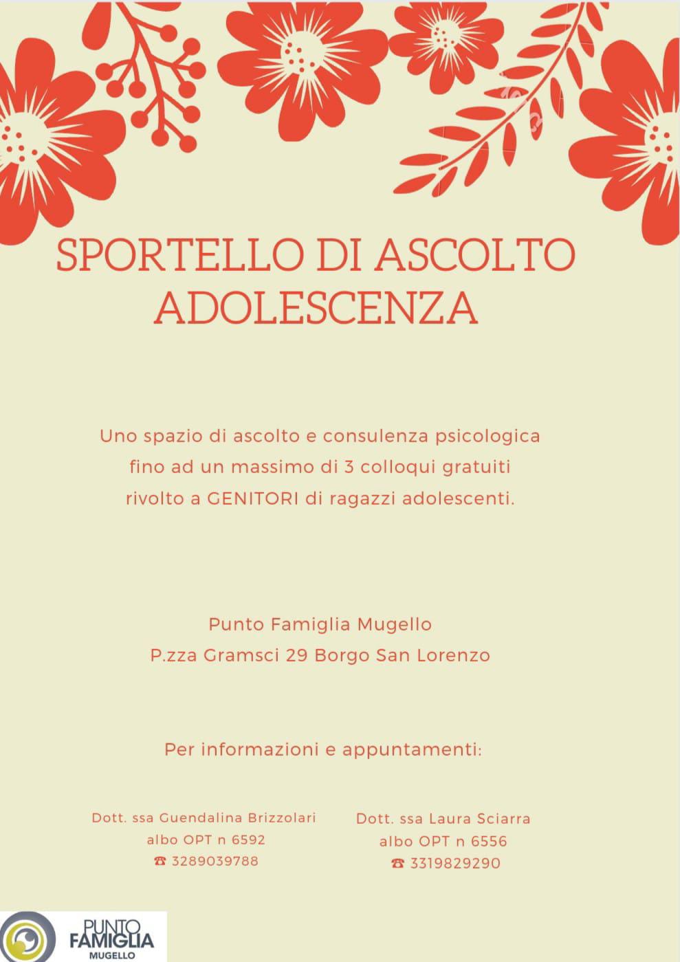 BORGO SAN LORENZO – Il punto famiglia di Borgo San Lorenzo ha riprende l’attività dello sportello di ascolto, rivolto ai genitori di adolescenti. Uno spazio gratuito di consulenza psicologica che prevede un massimo di tre colloqui con le psicologhe Guendalina Brizzolari e Laura Sciarra.