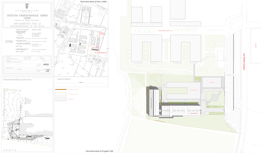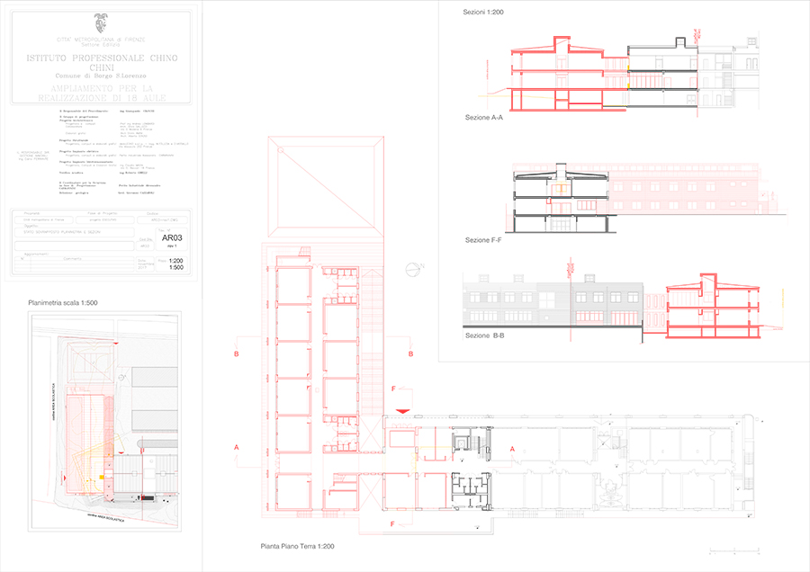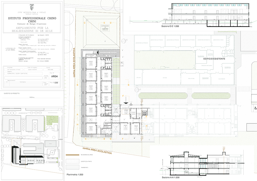 In totale, la ristrutturazione interessa 287 mq di superficie lorda dell’esistente edificio per una volumetria di 1080 mc per la realizzazione di 2 aule didattiche e locali portinerie e infermeria oltre l’atrio di ingresso.