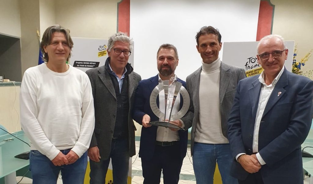 DICOMANO – Il trofeo “Gran Départ” del Tour de France è giunto a Dicomano giovedì 14 dicembre nella Sala del Consiglio Comunale. La presentazione della tappa si è svolta alla presenza del Sindaco del comune di Dicomano Stefano Passiatore, di Nicola Armentano, Consigliere Sport Citta Metro Firenze, con Daniele Bennati, Commissario Tecnico della Nazionale di Ciclismo e il giornalista Francesco Pancani, in veste di moderatore.