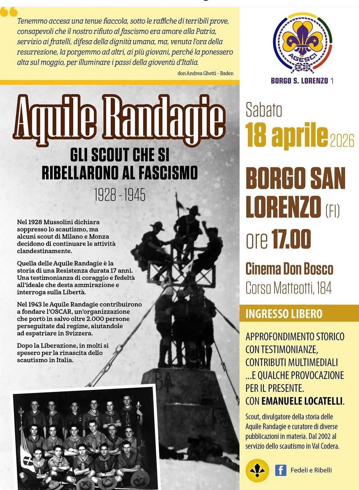 Sabato 18 Aprile dalle ore 17.00 al Cinema Don Bosco si terrà un approfondimento storico con testimonianze e contributi multimediali dal titolo “Aquile randagie. Gli scout che si ribellarono al fascismo”. La serata è a ingresso libero, e ricorderà la storia delle Aquile Randagie, gli scout che tra il 1928 e il 1945 scelsero di opporsi al fascismo portando avanti le loro attività in segreto.