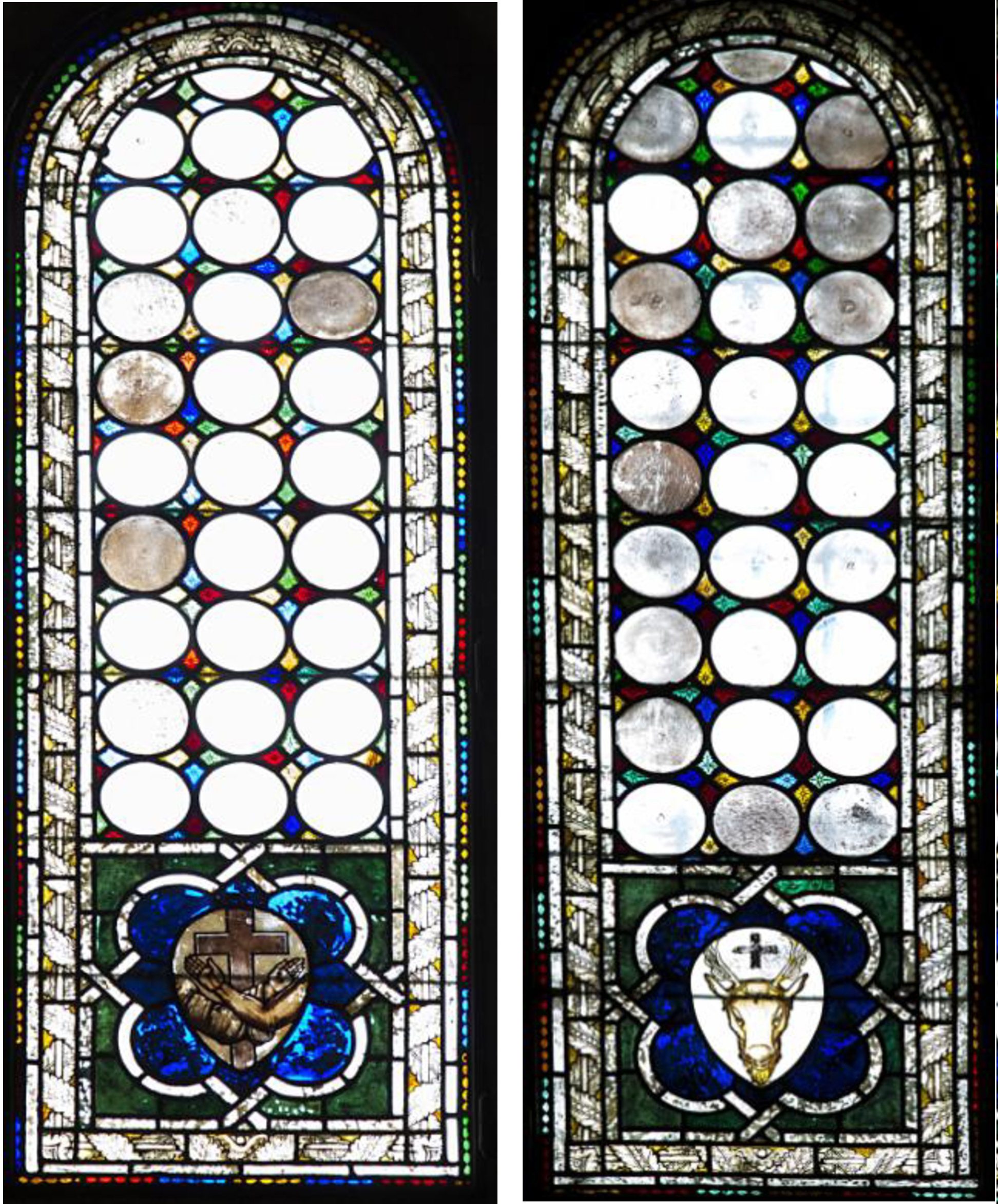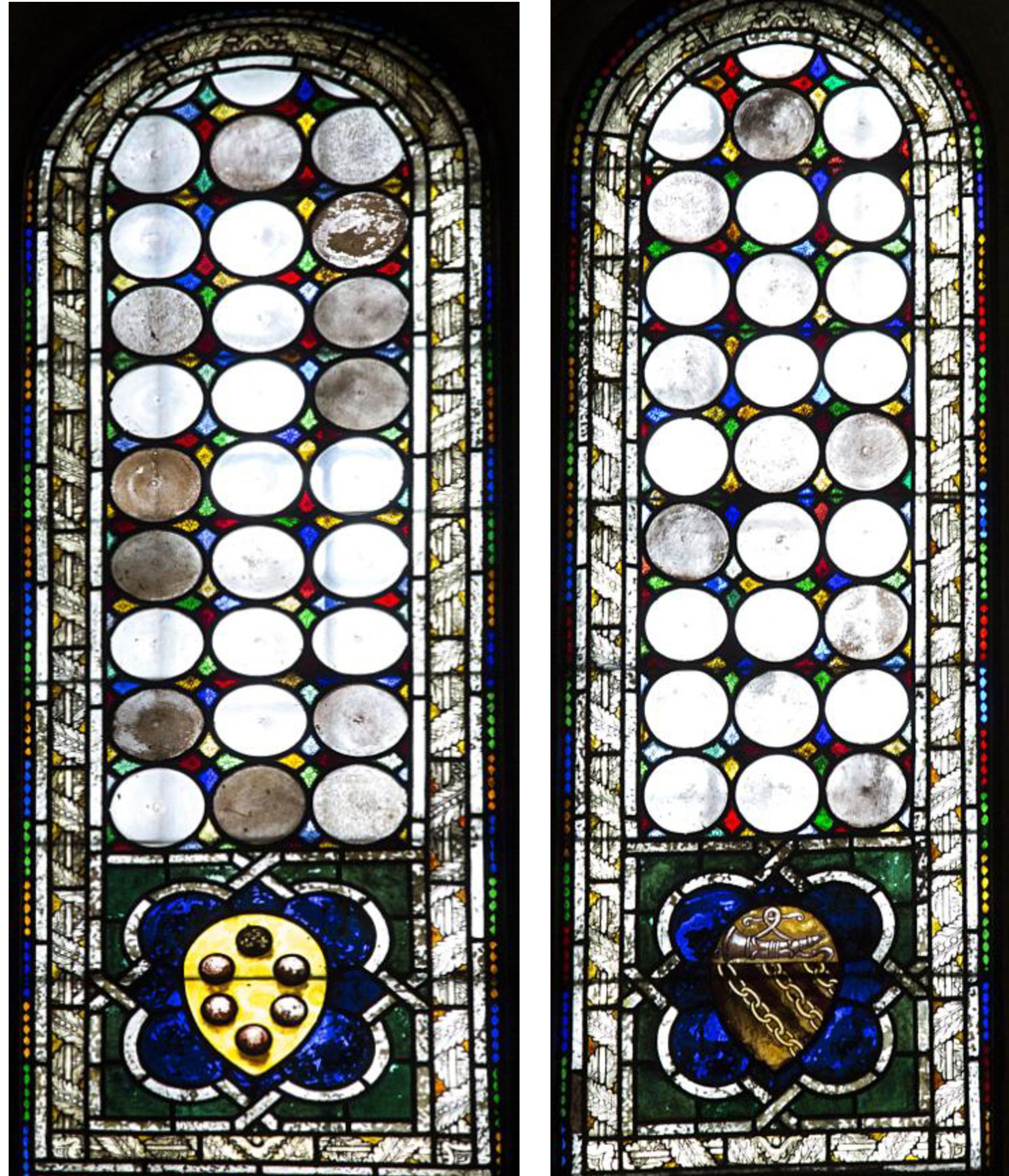 Le prime due vetrate riportano, entrambe, lo stemma della famiglia Gerini. Quelle al centro della navata, rispettivamente, a destra lo stemma dei Frati Minori Francescani (OFM) e a sinistra quello della famiglia degli Ubaldini “del Cervo”. Poi, in ultimo le due con lo stemma della famiglia de’ Medici.