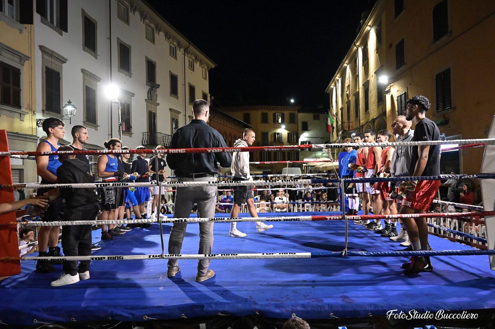 Quando ormai le speranze erano ridotte al lumicino visto che alle 20 e 30, orario previsto di inizio degli incontri, la pioggia non dava tregua, è avvenuto un piccolo miracolo e alle 20 e 45 si è potuto predisporre in fretta e furia l’intera struttura (il ring era già stato montato e debitamente coperto con teli nel pomeriggio) così che alle 21 e 30 i match hanno potuto prendere avvio.
