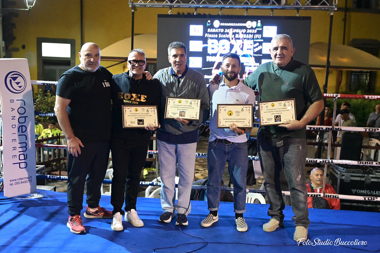 La serata, poi, è stata impreziosita e allietata dalla presenza di tre mostri sacri del pugilato italiano, tre campioni del mondo che sono stati intervistati sul ring da Alessandra Abramo: Francesco Damiani, Gianfranco Rosi e Maurizio Stecca. Una chiacchierata interessante che ha regalato ai presenti aneddoti e riflessioni sulla nobile arte da parte di chi ha saputo onorarla al meglio nella propria carriera agonistica.