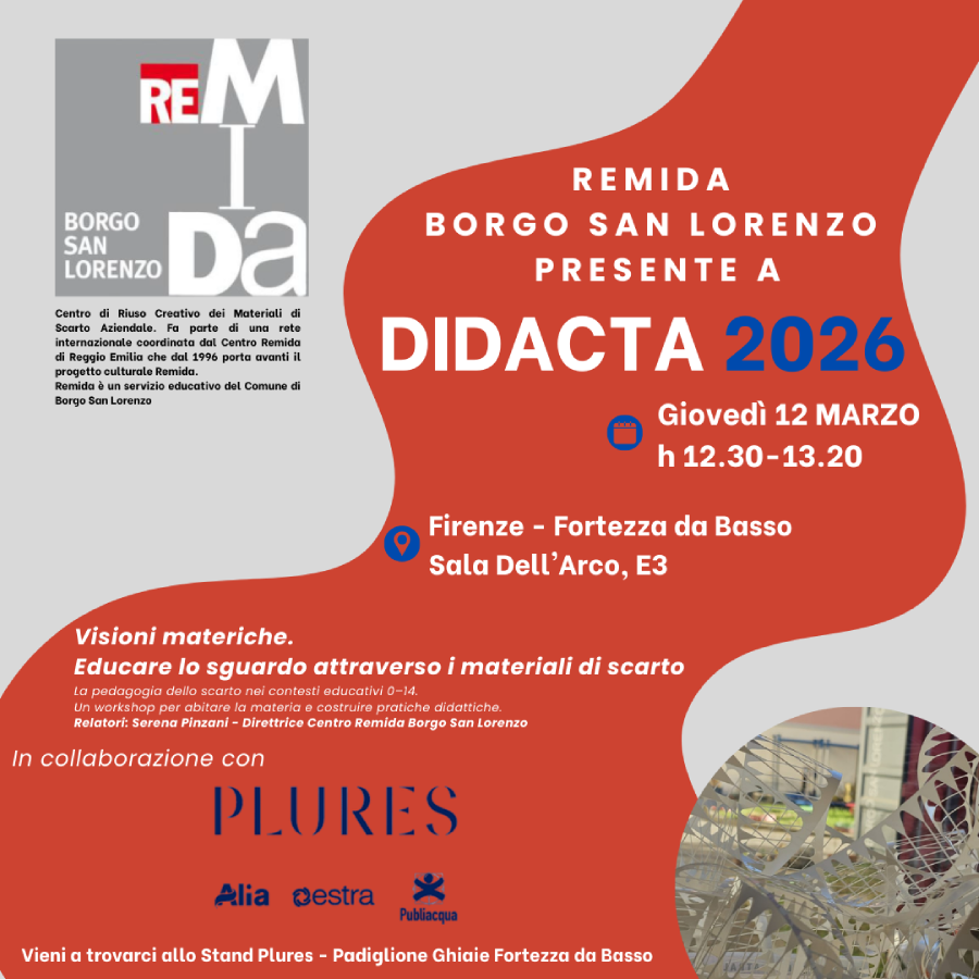 BORGO SAN LORENZO – Remida Borgo San Lorenzo parteciperà a Fiera Didacta Italia, in programma a Firenze presso la Fortezza da Basso, con il workshop “Visioni materiche. Educare lo sguardo attraverso i materiali di scarto”, dedicato alla pedagogia dello scarto nei contesti educativi 0–14.