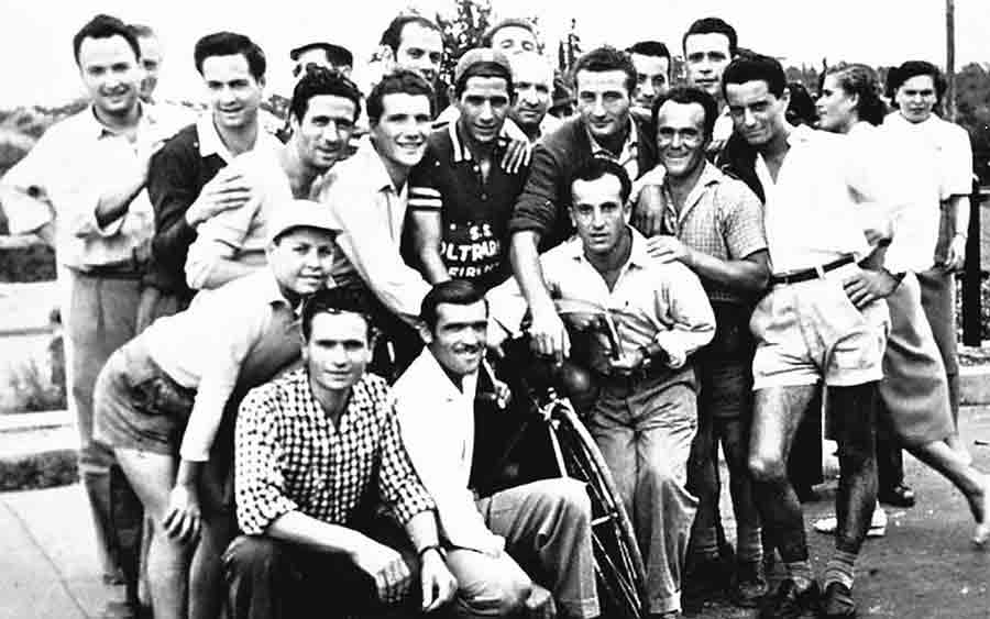 BARBERINO DI MUGELLO – Una foto di gruppo, facce allegre strette intorno a quello che, come ormai sapevano già tutti, sarebbe diventato un campione. Abbracciati ad un Gastone Nencini dei primi anni ’50, ancora dilettante, con il futuro già spianato davanti. “La gara – racconta Pier Luigi Nencini – dovrebbe essere stata organizzata proprio da un gruppo di barberinesi con arrivo intorno alla zona di Bilancino o proprio a Barberino. Vado a memoria, a quei tempi non avevo neanche dieci anni”. Ma tutte quelle persone abbracciate al campione, qualcuno le riconosce? O si riconosce?