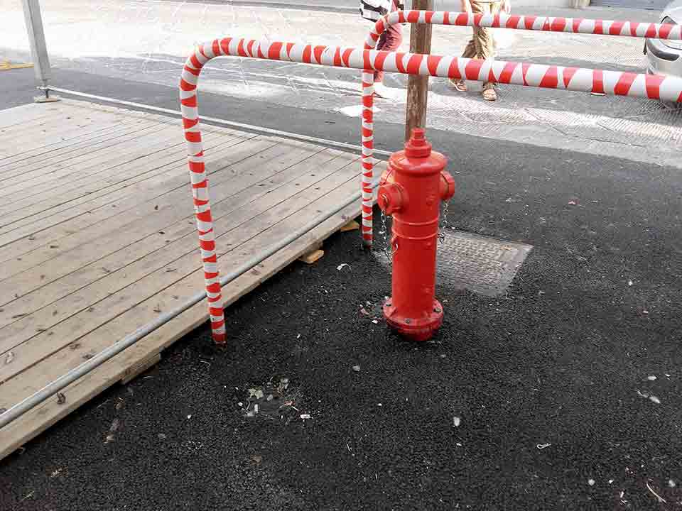 In piazza del Popolo, negli ultimi mesi è stato abbattuto e ripristinato (con calma) un idrante che per essere protetto dai parcheggiatori è stato circondato da transenne fisse.