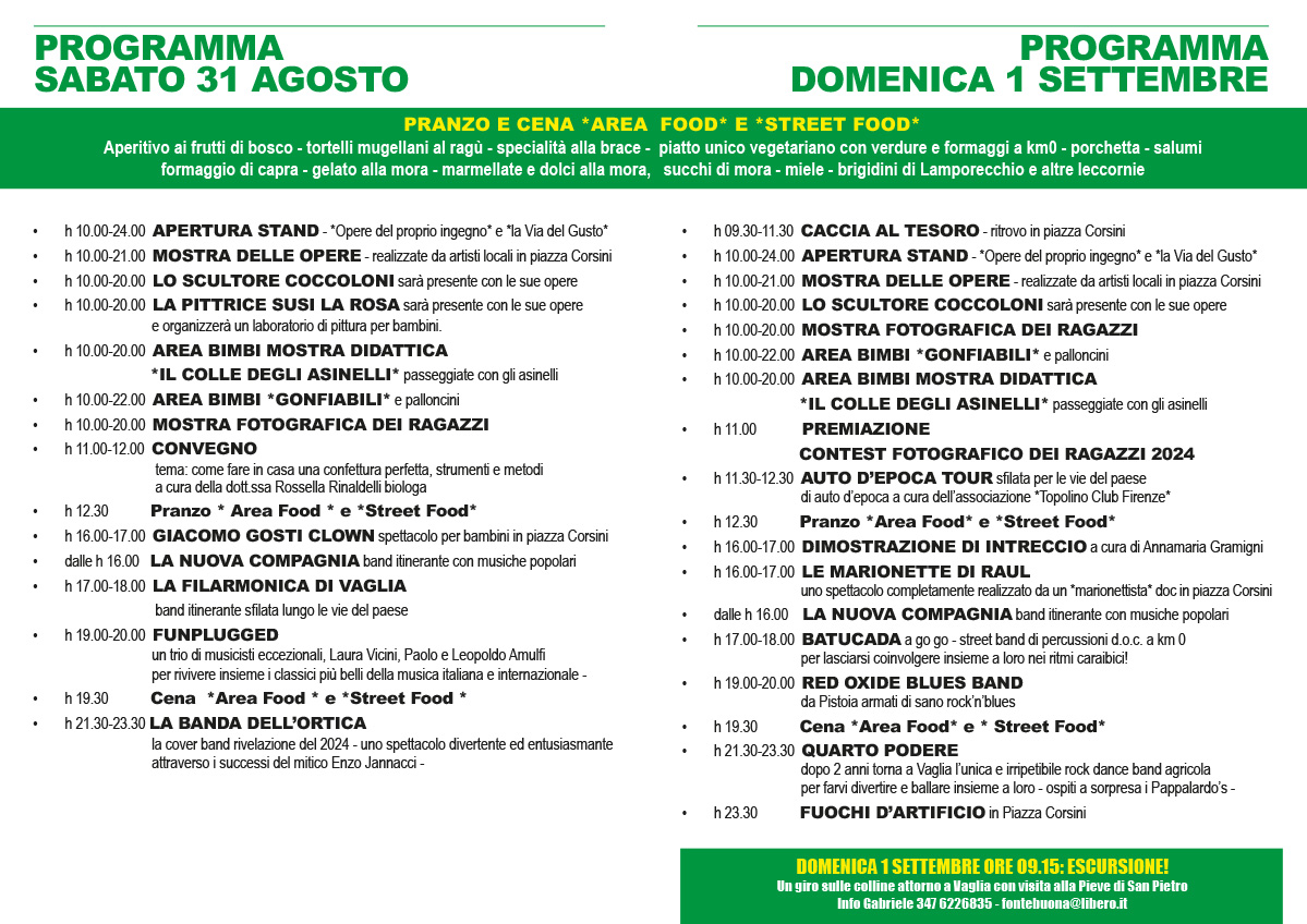 alle h 10.00 apertura degli stand con opere del proprio ingegno e la “Via del Gusto”, dove si potranno trovare aperitivi ai frutti di bosco, gelato artigianale alla mora, marmellate, dolci a base di marmellata di more selvatiche, more fresche,
