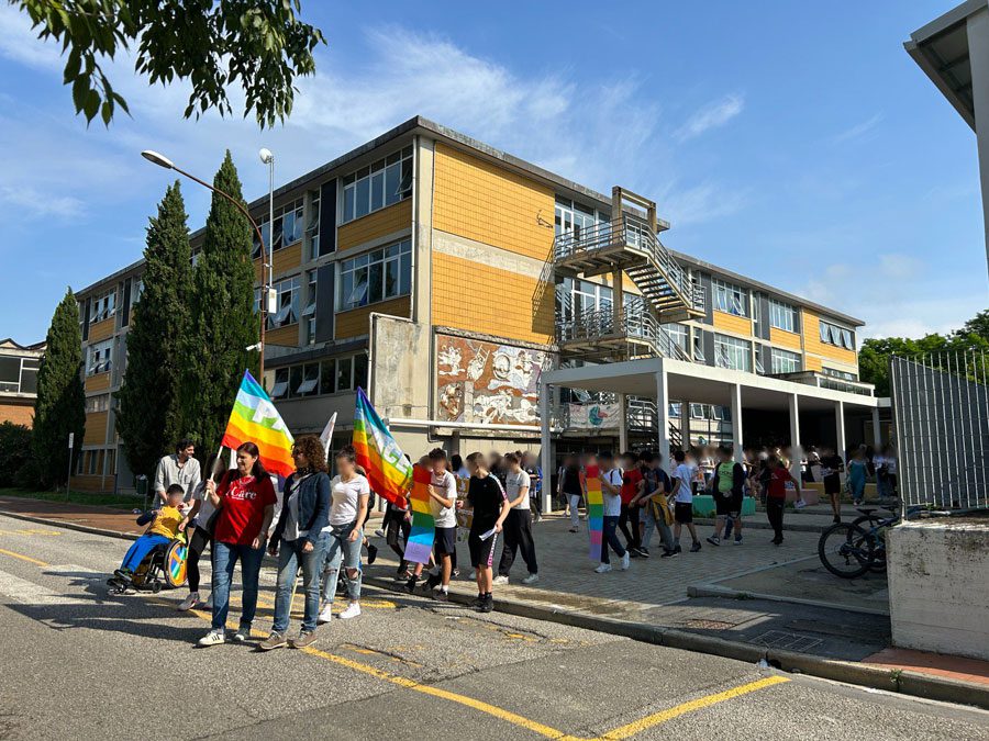 Insieme a loro anche una classe della scuola dell’infanzia Collodi che dalla propria struttura ha accompagnato il corteo fino alla Primaria di Secondo Grado dove ad attenderli c’erano gli studenti delle quinte.