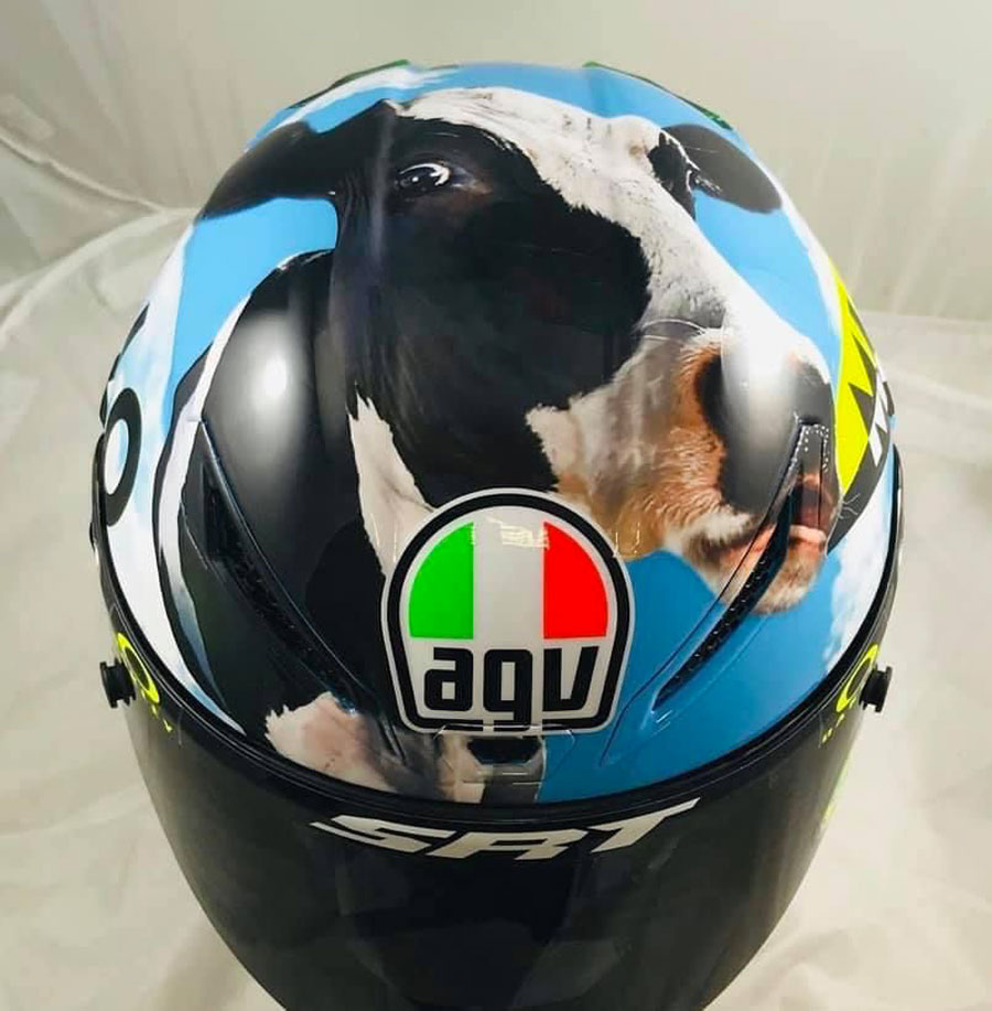 Quest’anno il casco presenta una mucca che urla “Muuuu…GELLO” mentre bruca nelle campagne di Scarperia. In lontananza infatti si può vedere lo skyline del centro storico del Comune mugellano, con la torre di Palazzo dei Vicari in bella vista.