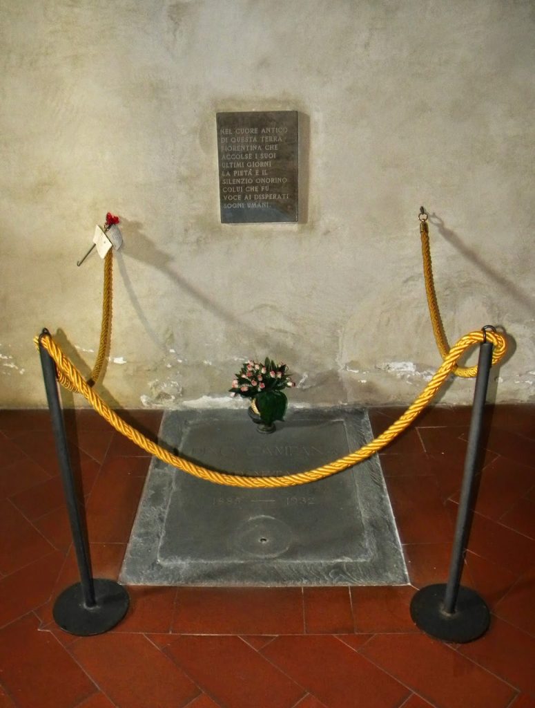 Proprio all’interno della chiesa dell’Abbazia dei Santi Salvatore e Lorenzo riposano infatti le spoglie di Campana, in fondo alla navata sinistra sotto una semplice pietra vicino ad una bella cappella con affreschi seicenteschi.