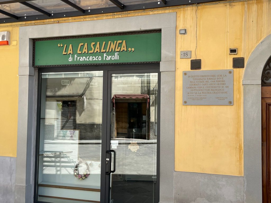 La camminata per le vie del borgo scopre poi alla vista la farmacia, la cui attività il poeta avrebbe dovuto – mens sana in corpore sano – continuare per volontà del padre, e la Tipografia F. Ravagli (ora negozio di casalinghi, sul quale tuttavia campeggia targa commemorativa) che nel 1914, grazie al contributo economico di alcuni marradesi, stampò in mille copie la prima edizione dei Canti orfici , riscritti a memoria dopo la ben nota disavventura che vide smarrito da Soffici a Firenze il manoscritto originario.