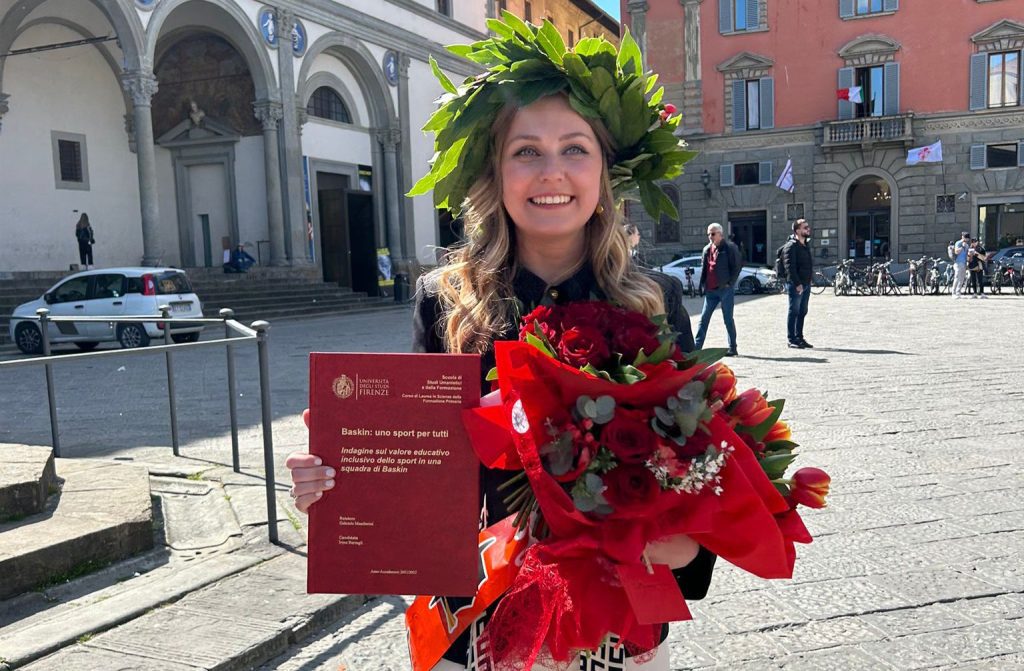 BORGO SAN LORENZO – Si è laureata oggi, lunedì 3 aprile, in Scienze della Formazione primaria all’Università di Firenze, Irene Barzagli, docente di scuola Primaria a Borgo San Lorenzo, con una tesi incentrata sul Baskin, sport e Inclusione. La giovane insegnante, classe 1998, ha iniziato a giocare con gli Oranges a settembre e tra un allenamento e l’altro ha scritto la propria tesi, che comprendeva anche un questionario che ha coinvolto tutti, dai genitori agli atleti fino agli operatori.