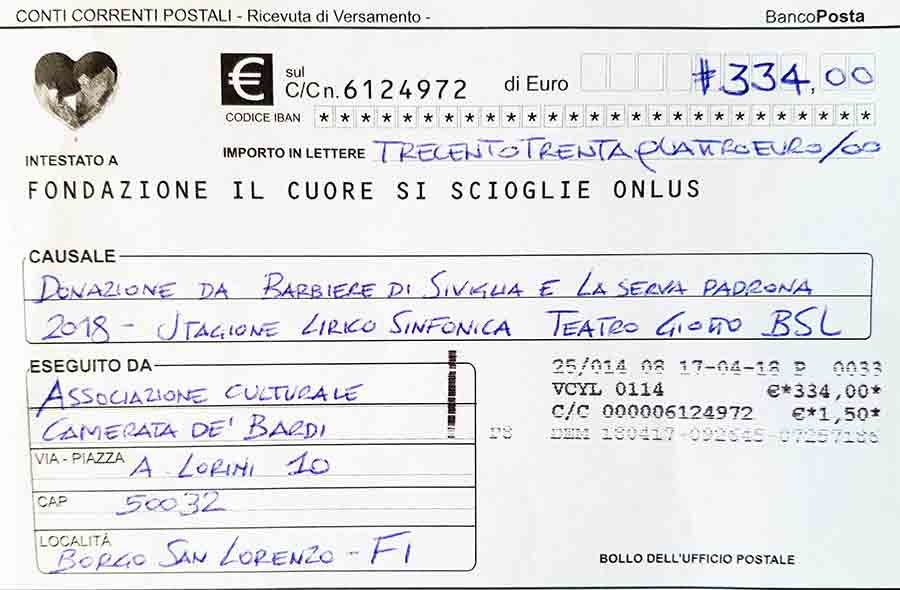 Il ringraziamento va al pubblico presente alle due opere liriche del 2018, il rossiniano Barbiere di Siviglia e La serva padrona del marchigiano Pergolesi, che, con l’offerta per il libretto di sala, ha permesso di raccogliere e donare 334 euro.