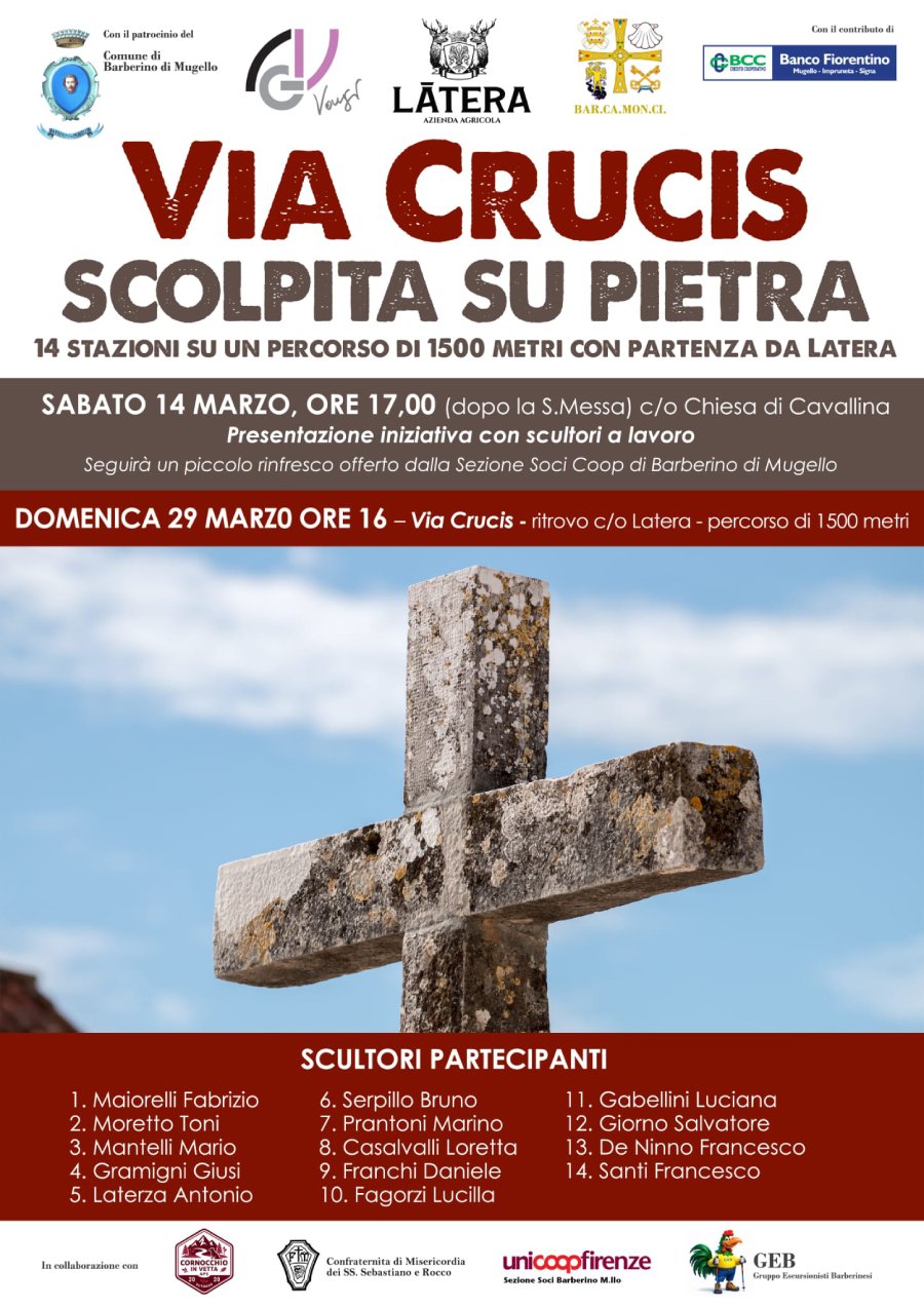 BARBERINO DI MUGELLO – Sabato 14 Marzo alle 17.00 alla chiesa di San Jacopo a Cavallina sarà presentata la via crucis scolpita su pietra, realizzata da 14 scultori mugellani, che hanno curato altrettante stazioni che saranno installate su un percorso di circa 1500 metri, con partenza da Latera.