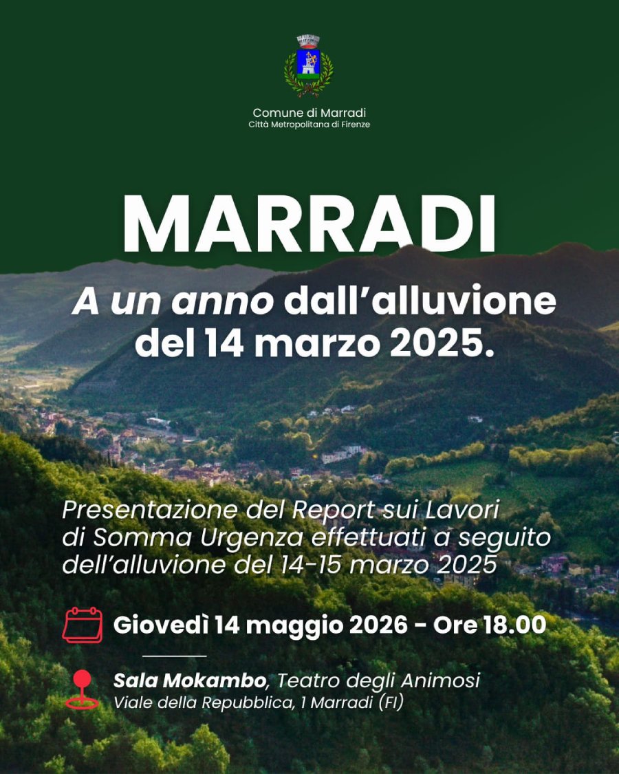 MARRADI – La fotografia dei danni al territorio e le emergenze provocati dall’alluvione del Marzo 2025 e quella dei lavori di somma urgenza realizzati, un anno dopo. “Marradi a un anno dall’alluvione del 14 marzo 2025” è il titolo dell’incontro che l’Amministrazione comunale organizza giovedì 14 Maggio alle ore 18.00 alla Sala Mokambo al Teatro degli Animosi, nel quale sarà presentato il report sugli interventi finora effettuati.