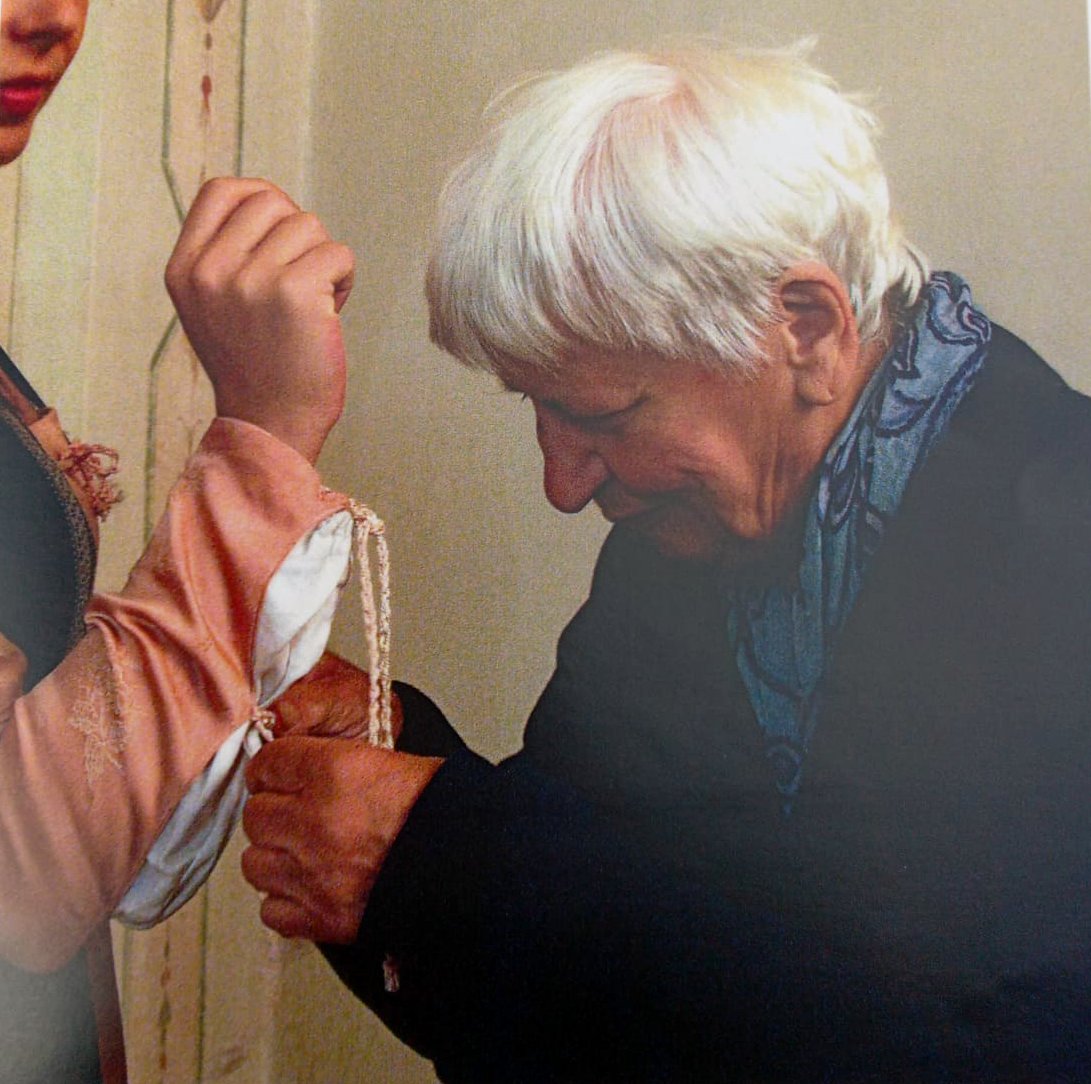 “Mia madre ha sempre dimostrato amore con gli abiti, anche se era impegnata trovava sempre il tempo di creare un vestito per me”: è così che Perla Dalla Tana racconta sua madre, Giacomina Maestrini, da tutti era conosciuta come Mina. Mina, nata nel 1924, ha origini marradesi, la sua famiglia si trasferì a Milano ed è qui che iniziò a lavorare come sarta già all’età di 15 anni. Nel suo lavoro si è sempre dimostrata piena di talento, prima di occuparsi di teatro cuciva abiti da sposa per un atelier a Monte Napoleone, un mestiere che richiedeva grande attenzione ai dettagli, capacità che le sarà sempre utile anche quando inizierà a lavorare al Piccolo Teatro, dove rimarrà per ben 27 anni.
