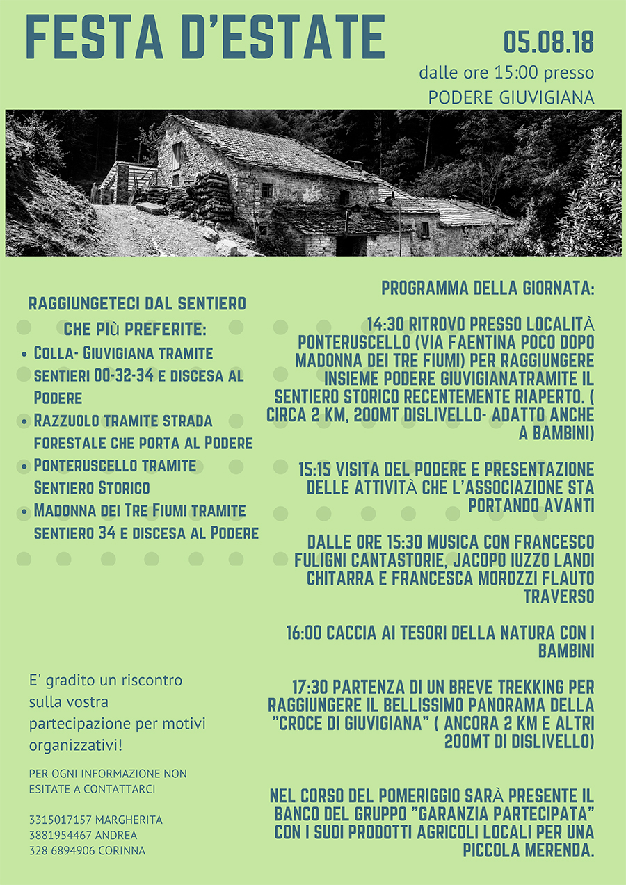 BORGO SAN LORENZO – Un pomeriggio in allegria, con tante attività per grandi e piccini. È questa la proposta che il podere di Giuvigiana propone con la sua “Festa d’estate” che si terrà domenica 5 agosto a partire dalle 15.00.