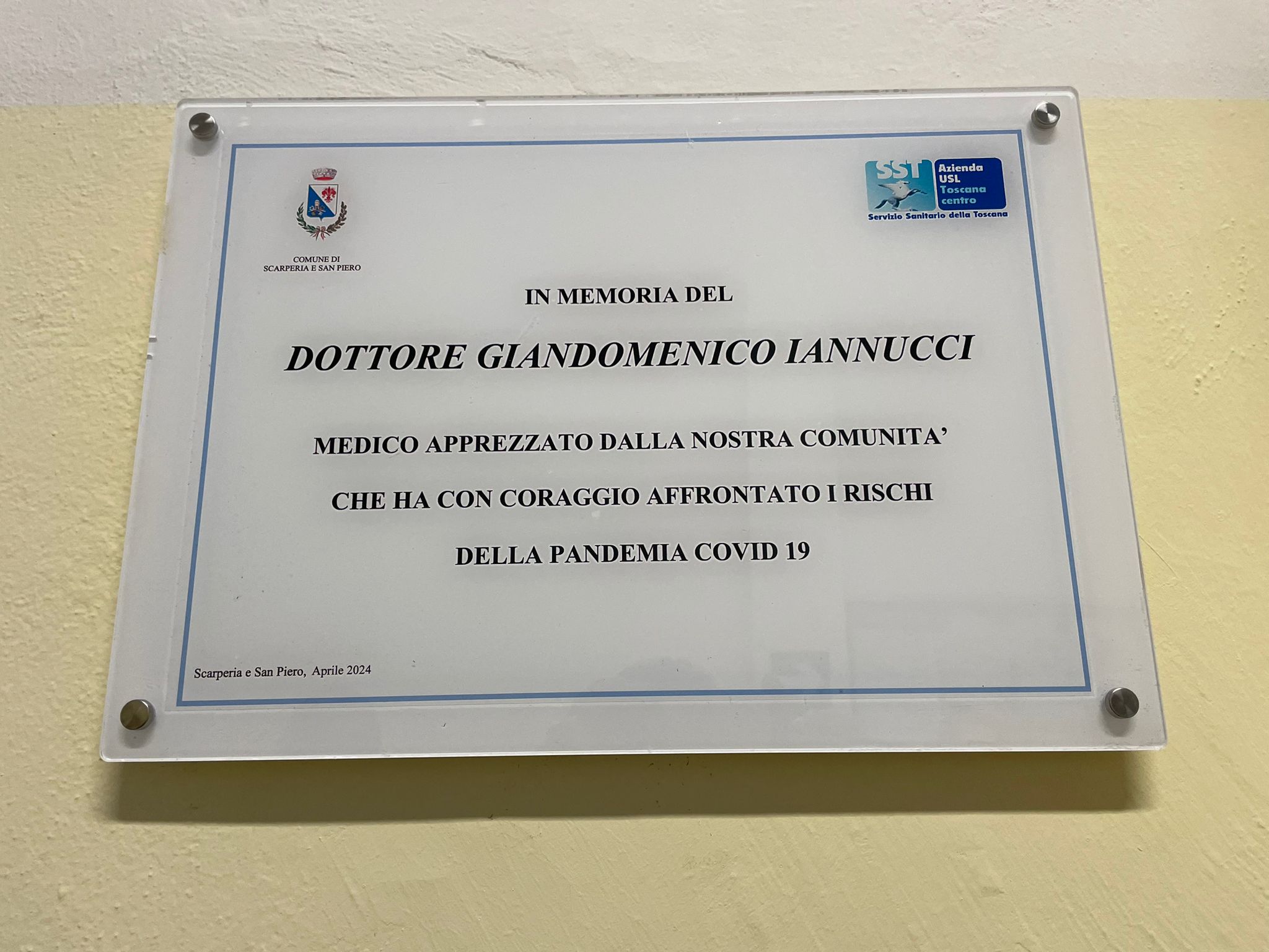 Questo il testo riportato sulla targa: “In memoria del dottor Giandomenico Iannucci, medico apprezzato dalla nostra comunità, che ha con coraggio affrontato i rischi della pandemia Covid-19. Scarperia e San Piero, Aprile 2024”.