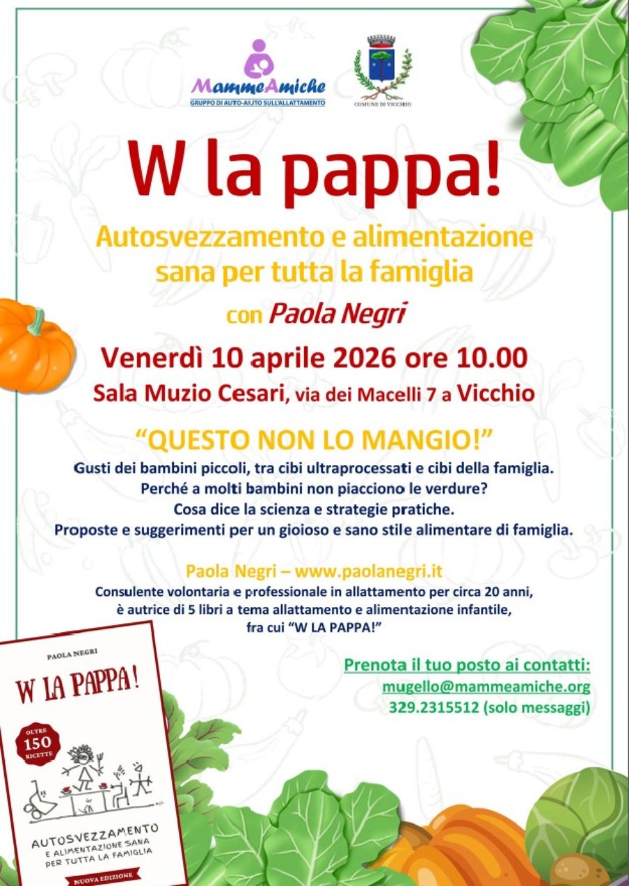 VICCHIO – Venerdì 10 Aprile dalle 10.00 alle 12.00 alla sala Muzio Cesari di Vicchio, in via dei Macelli 7, si terrà l’incontro a ingresso gratuito “W la pappa. Alimentazione sana per tutta la famiglia”, organizzato dal gruppo MammeAmiche, sezione Mugello.