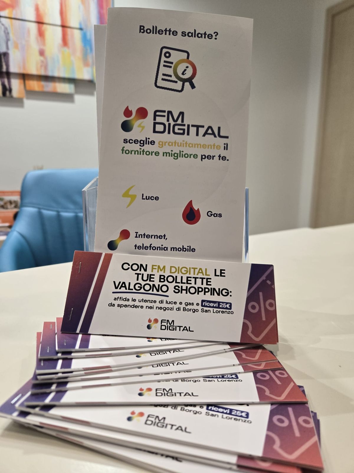 Negli ultimi anni il lavoro sulle utenze si è intrecciato con un’idea più ampia: se un’impresa cresce grazie al territorio, deve restituire valore al territorio. Per questo sono nati i buoni da 25 euro spendibili esclusivamente nei negozi del centro storico. Non online. Non su piattaforme esterne. Solo nelle attività di Borgo San Lorenzo. Un circuito semplice che ha portato nuove persone nelle botteghe, più movimento nelle vie centrali e una rete di collaborazione tra attività locali.