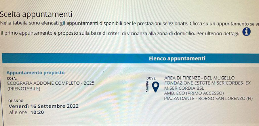 “Ho telefonato a uno studio privato, a Bioscienze, e ho avuto l’appuntamento dopo 48 ore. Se avessi voluto utilizzare il servizio sanitario pubblico il primo appuntamento sarebbe stato il 16 settembre, a Borgo San Lorenzo. Ho provato anche a cercare in tutta l’area provinciale, e come potete vedere dalle immagini è andata ancor peggio”.