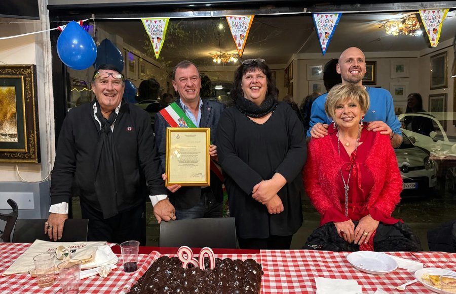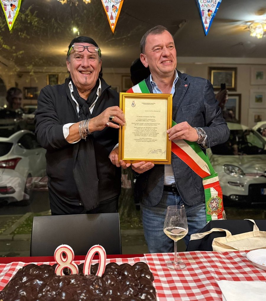 SCARPERIA E SAN PIERO – Grande festa a Scarperia e San Piero per gli ottant’anni di Roberto Bini. Figura storica di San Piero a Sieve, Roberto detto “i’Trappola” è il proprietario del Barrettino di Cardetole, punto di riferimento per la popolazione della frazione mugellana. Per questo motivo anche l’amministrazione comunale di Scarperia e San Piero ha voluto celebrarlo in occasione della festa organizzata nei giorni scorsi, con il sindaco Federico Ignesti che ha voluto personalmente consegnare una pergamena al festeggiato: “Il Comune di Scarperia e San Piero – si legge nel documento – in occasione dell’ottantesimo compleanno del Sig. Roberto Bini, detto ‘i’Trappola’, desidera rendere omaggio a una figura profondamente legata alla vita culturale e sociale di San Piero a Sieve. Storico proprietario del ‘Barrettino’ di Cardetole, Roberto Bini ha saputo fare del suo bar un luogo di incontro, di relazioni e di comunità. Accanto a questo, ha coltivato con passione la sua attività artistica, esprimendosi attraverso la pittura e lasciando nei suoi quadri uno sguardo personale sul territorio, sulle persone e sulla quotidianità. Con stima e riconoscenza, l’Amministrazione comunale si unisce agli auguri per questo importante traguardo di vita”.