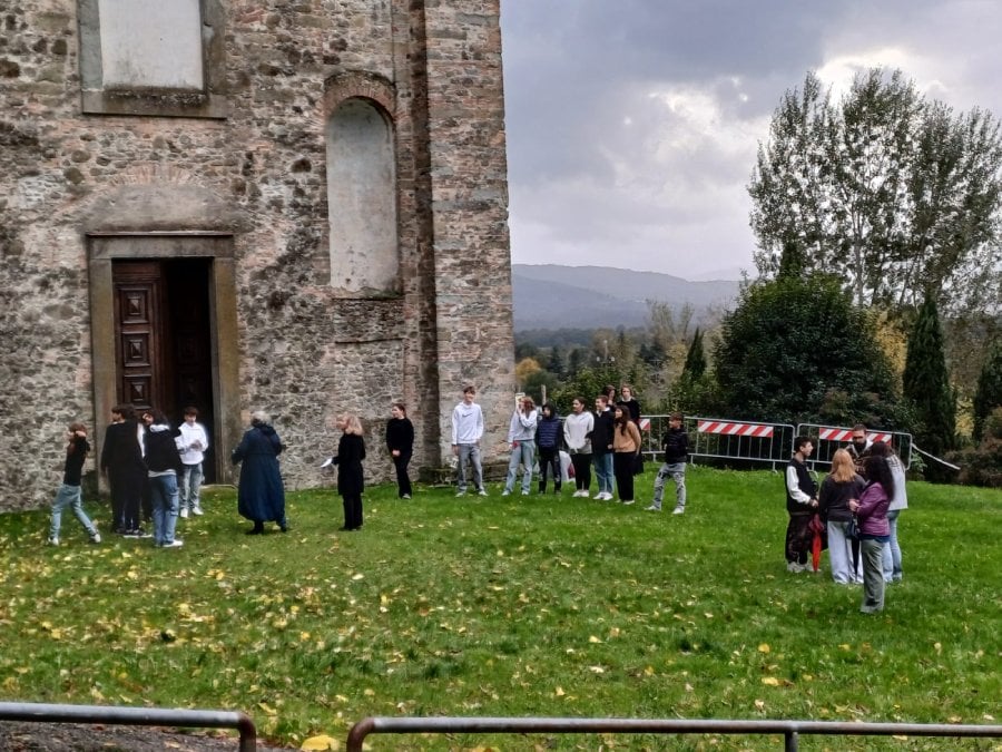 Nel pomeriggio, nel prato antistante l’Oratorio, si è svolta una performance che ha visto protagonisti i ragazzi della Scuola Media di Scarperia, classe III C, che, sotto la guida della prof.ssa Chetti Miniati e la regia di Anna Scalabrini, hanno recitato poesie scritte durante le ore di italiano esprimendo il desiderio che l’Oratorio torni a vivere, che le opere siano portate a termine, che il tabernacolo non resti vuoto; hanno poi recitato i primi 21 versi del XXXIII canto del Paradiso di Dante, la “Preghiera di San Bernardo alla Vergine”, intervallati da canti mariani eseguiti dal coro parrocchiale. A seguire, alcuni interventi istituzionali da parte della dirigente scolastica, professoressa Meri Nanni e della stessa professoressa Miniati, a testimonianza di un supporto dell’Istituto che da più di dieci anni è impegnato nel progetto “Riscopriamo l’Oratorio della Madonna del Vivaio”. Presenti per l’amministrazione comunale, il sindaco Federico Ignesti e il presidente del Consiglio comunale, Simone Magnolfi; per la parrocchia, don Binu e il coro; per il comitato, numerosi volontari e la presidente, professoressa Grazia Frascati. Nonostante la pioggia, non è mancata la partecipazione e l’entusiasmo dei genitori dei ragazzi coinvolti e della cittadinanza che intorno a questo bene prezioso riesce a costruire senso di collaborazione e comunità.