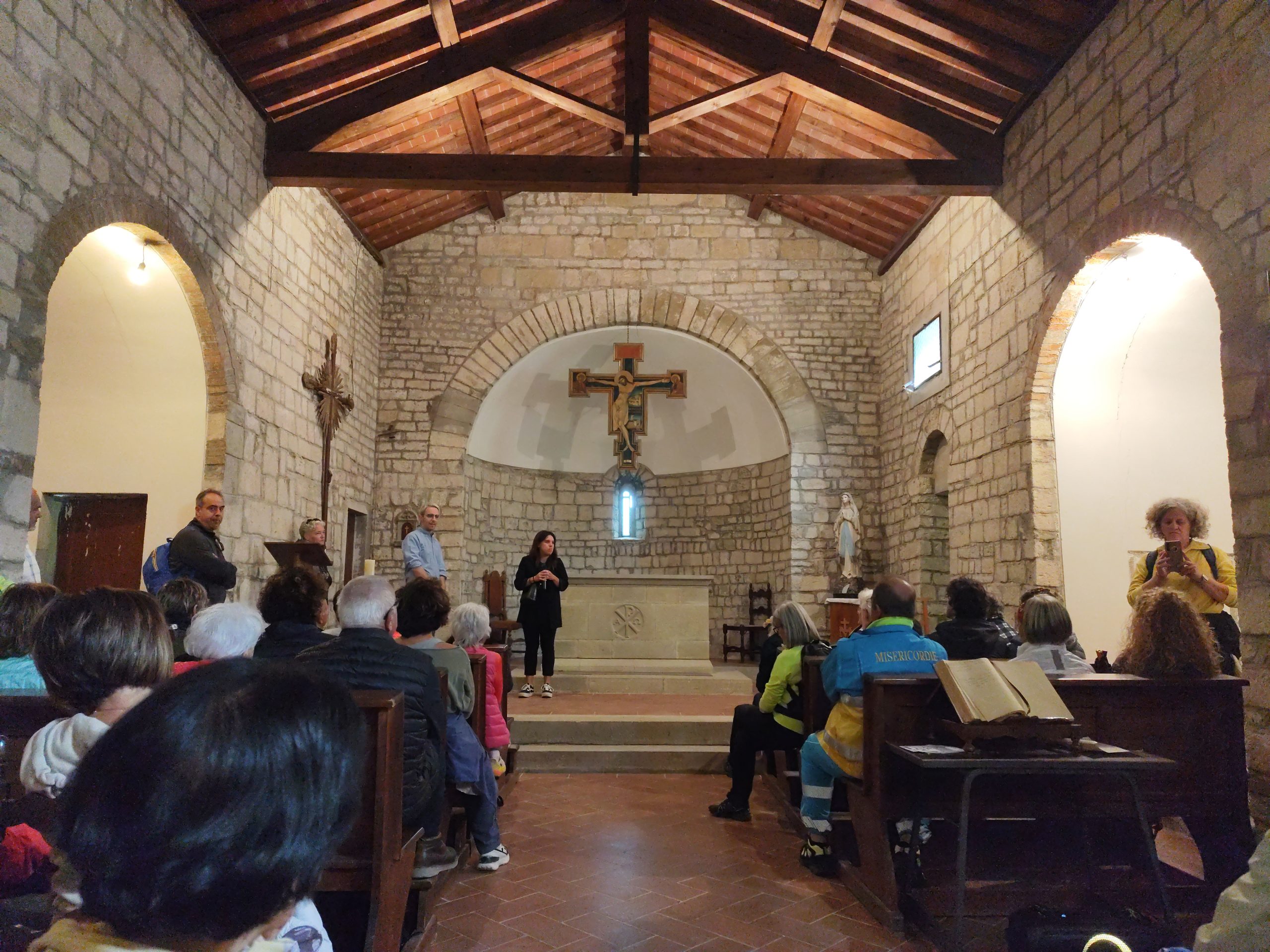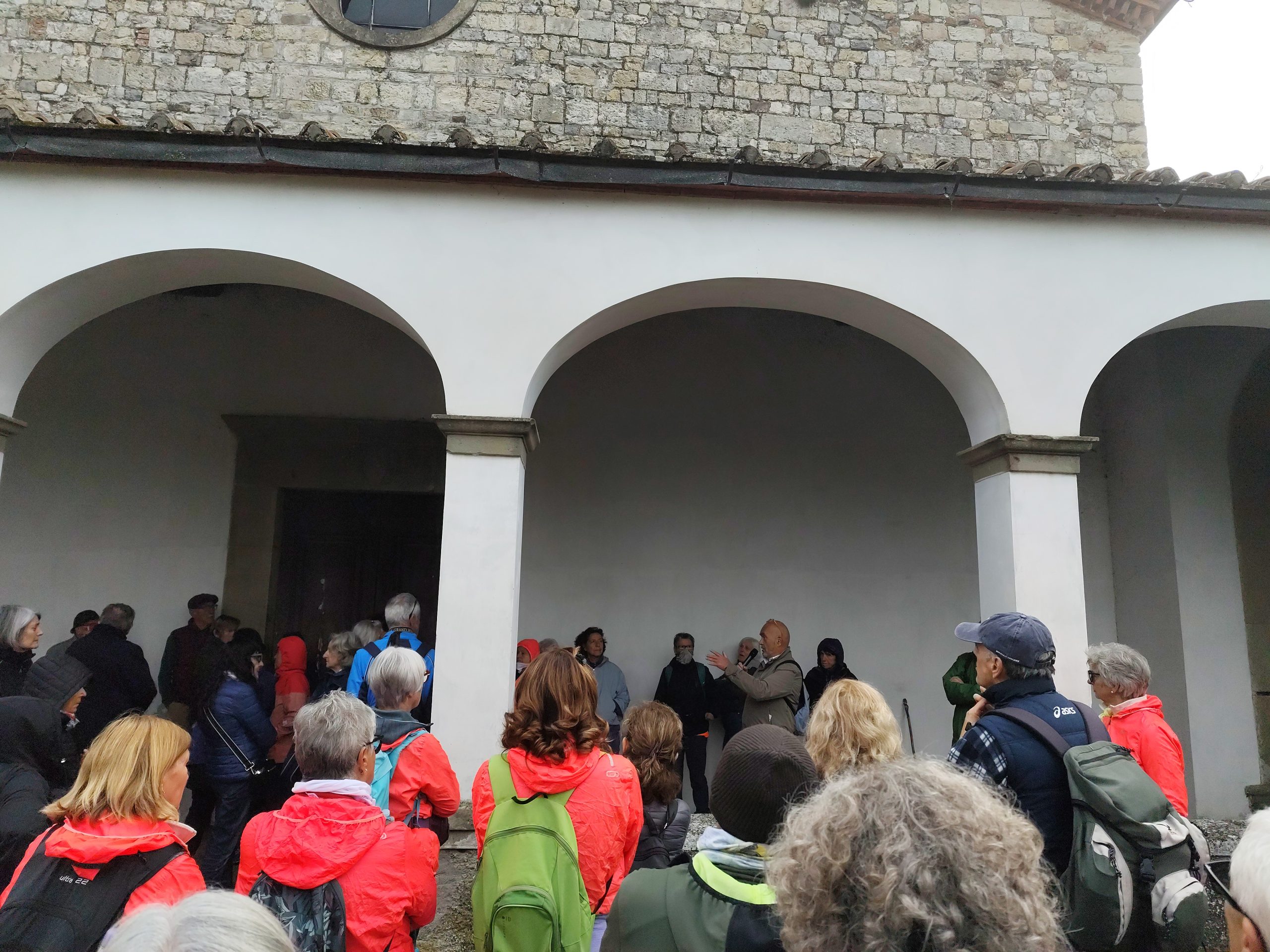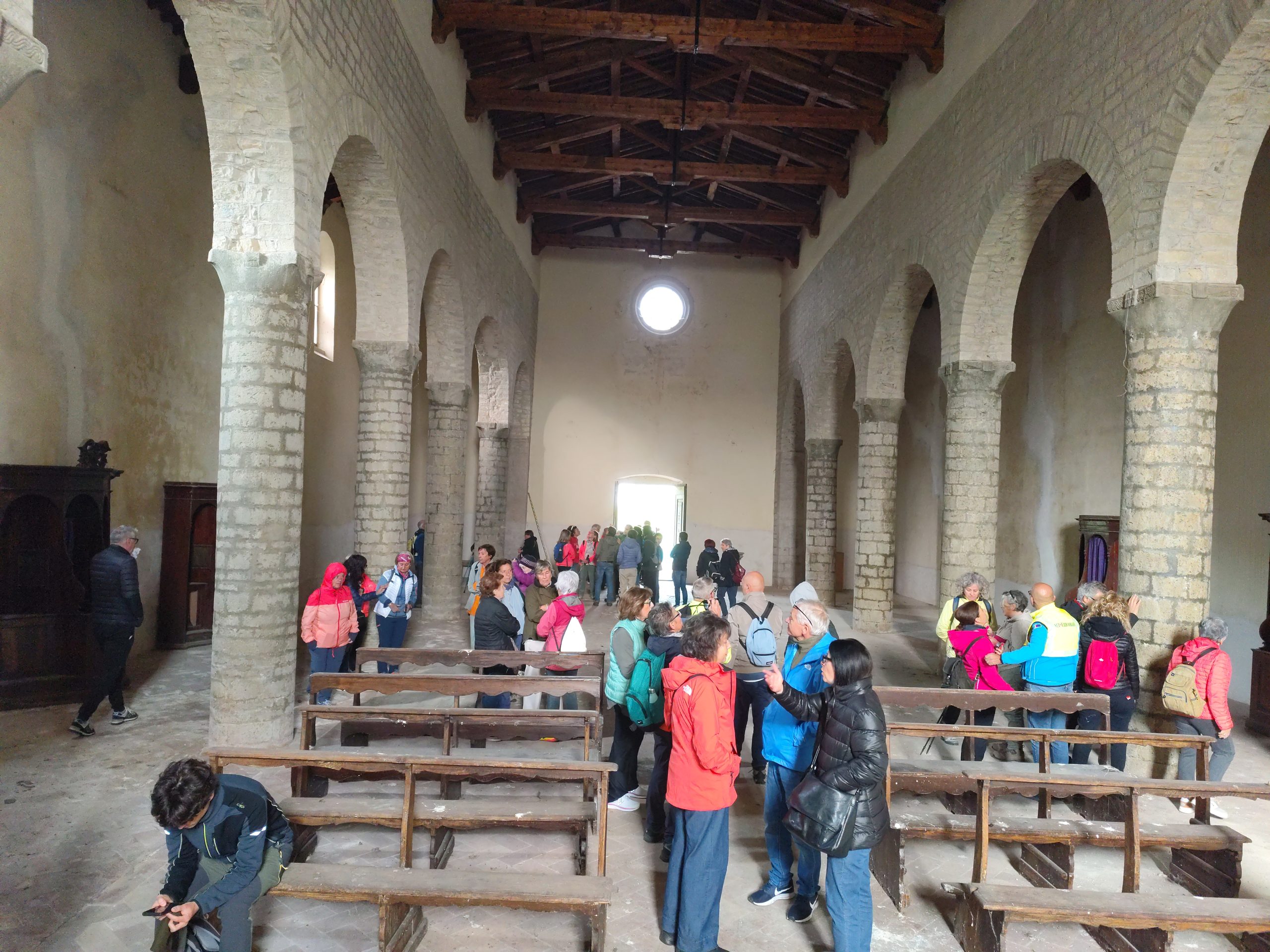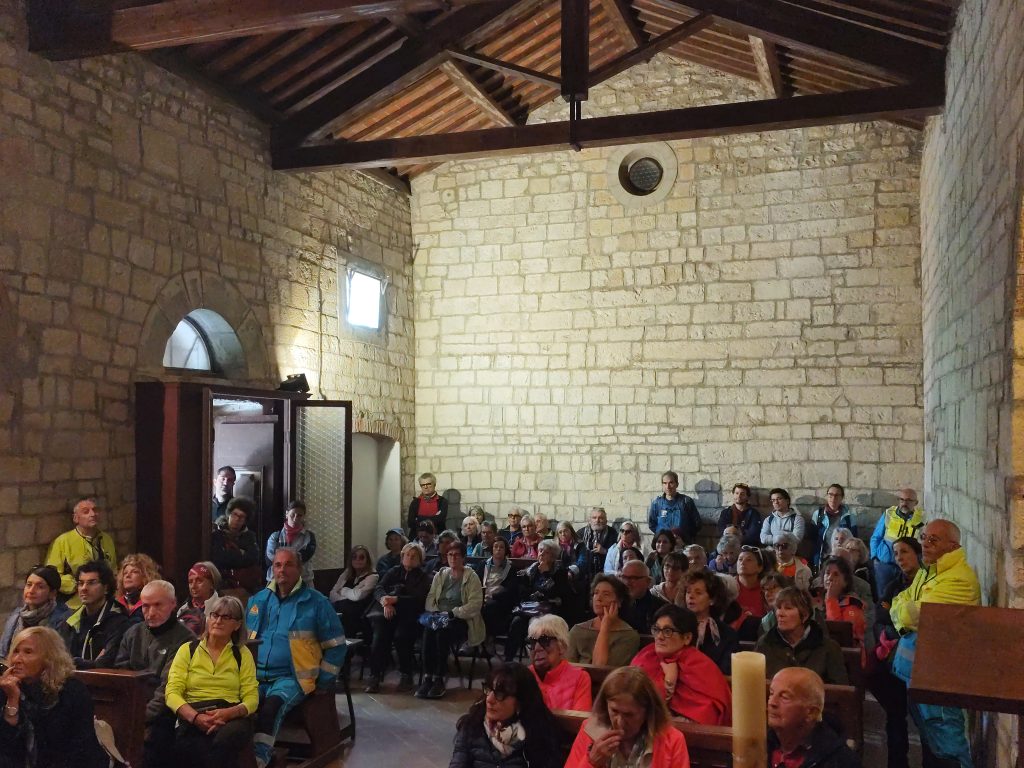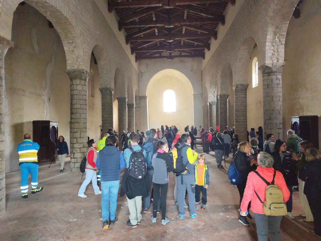 La nebbia mattutina non ha scoraggiato i numerosi partecipanti, che a piedi o con la navetta hanno raggiunto San Giovanni. La Pieve riaperta per l’occasione, ha destato grande emozione. Paolo Monnini, del gruppo di ricerca chiese di Barberino ne ha tracciata la storia. Situata in posizione strategica nei pressi di antiche e importanti vie di comunicazione, la chiesa ha sempre avuto un ruolo di vedetta e controllo. Nonostante l’incognita della sua fondazione San Giovanni e da considerarsi tra le pievi più antiche del Mugello, insieme a quella di San Agata e Cornacchiaia. La chiesa ormai spoglia di ogni opera, contiene ancora l’ antico battistero.