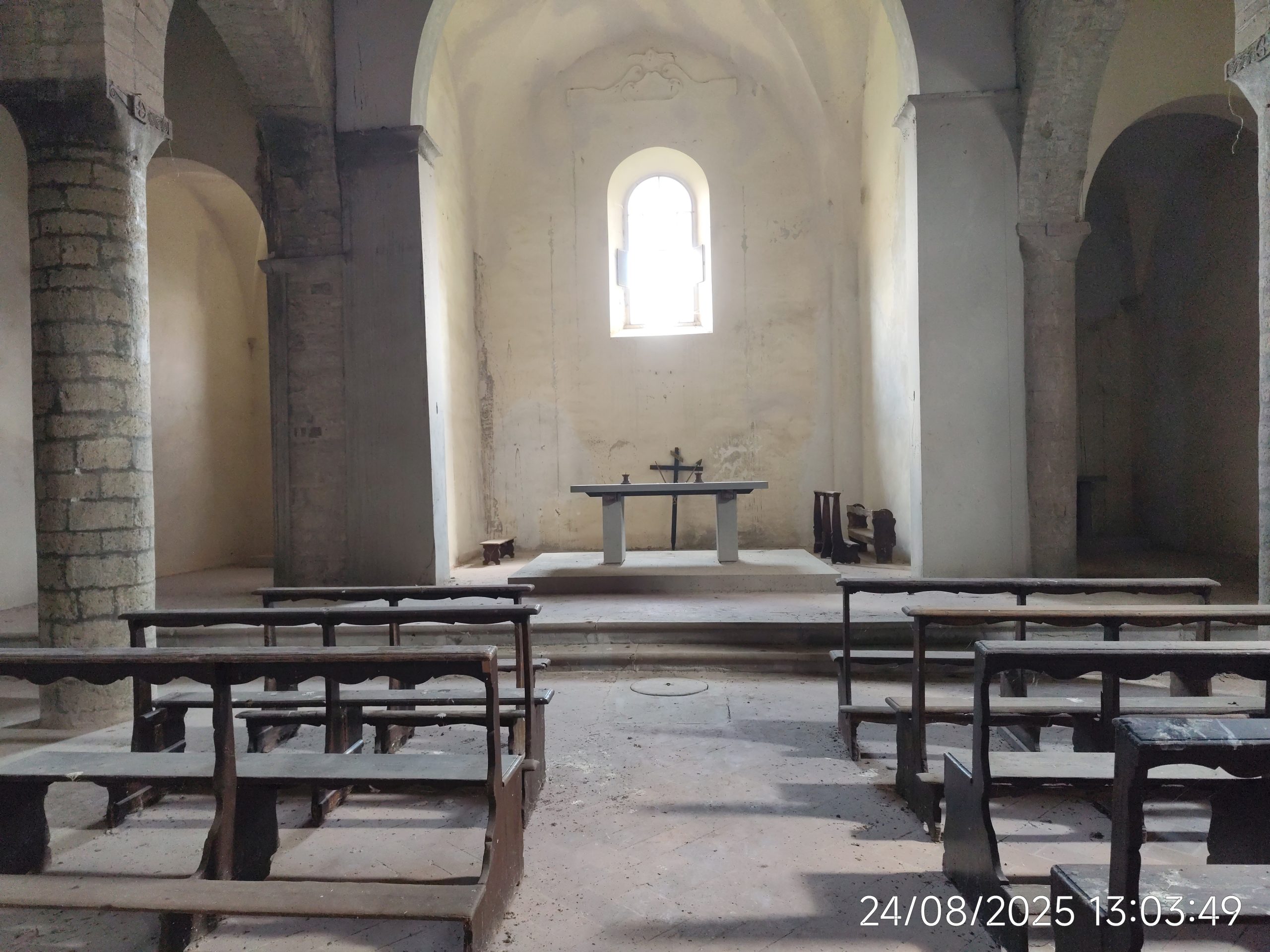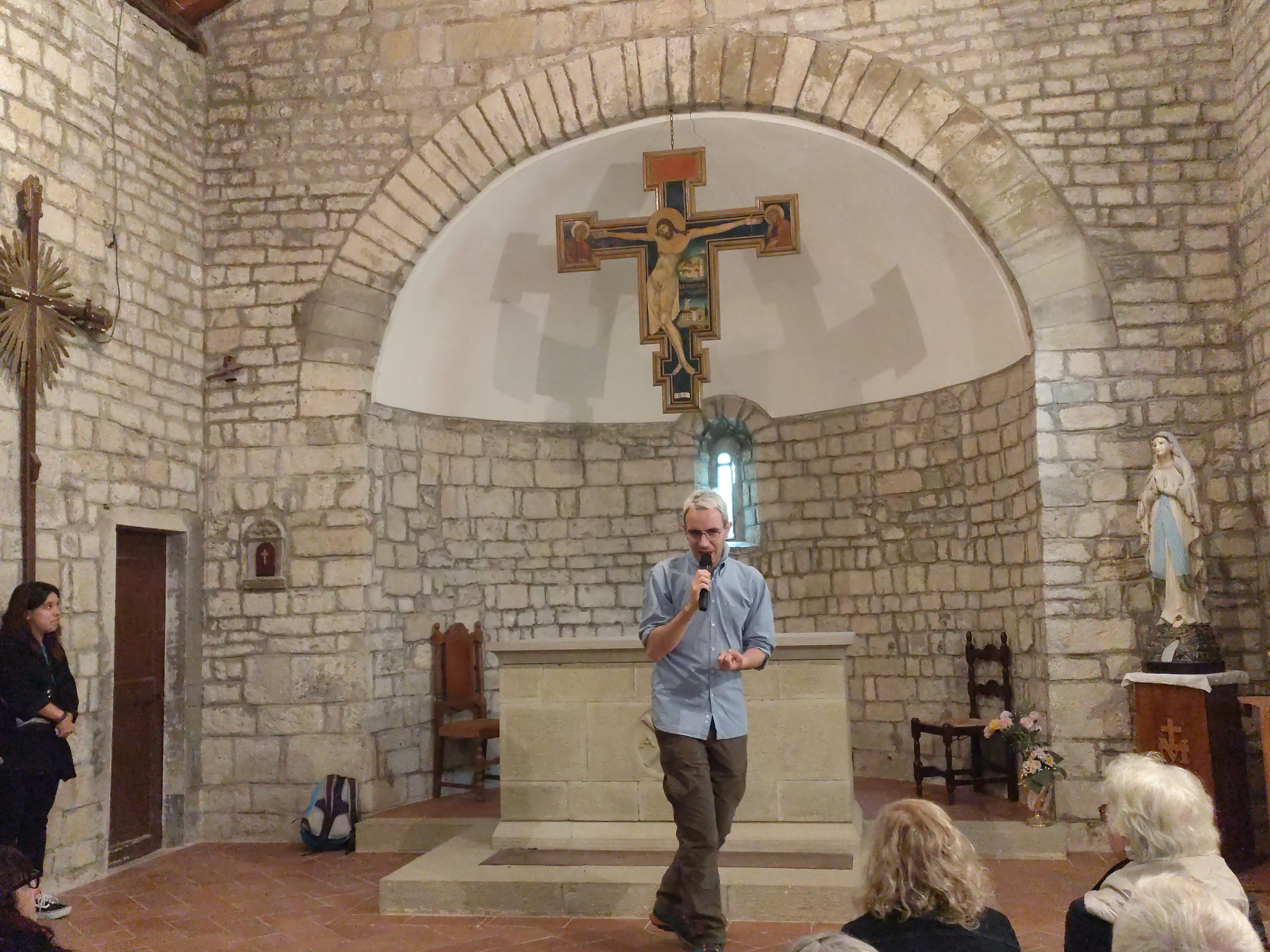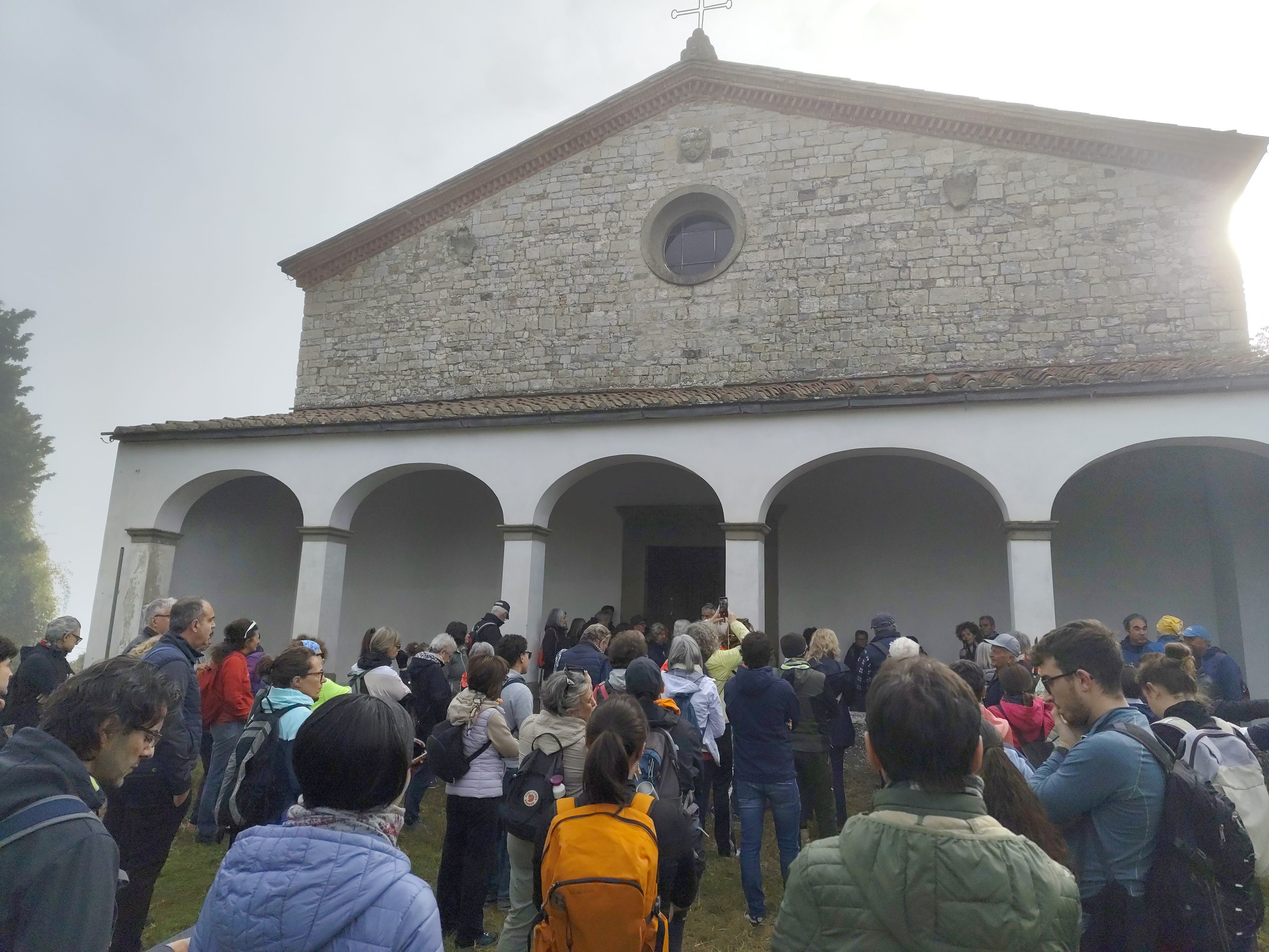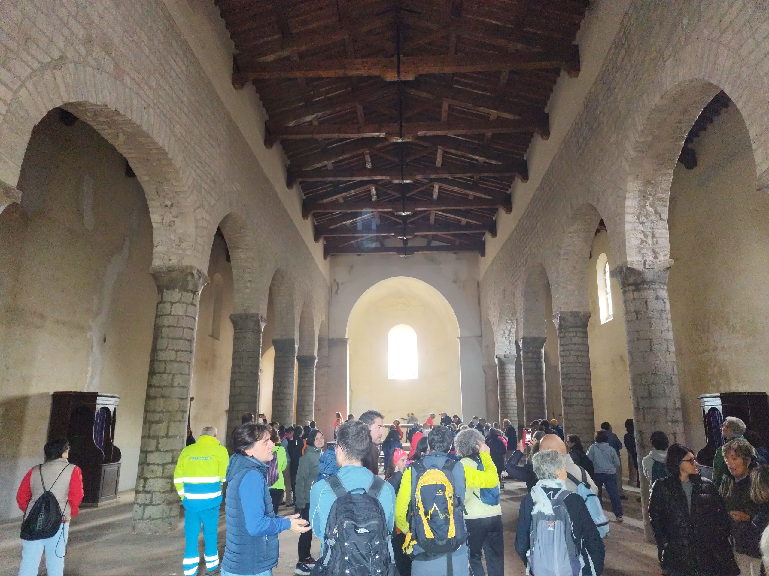 La nebbia mattutina non ha scoraggiato i numerosi partecipanti, che a piedi o con la navetta hanno raggiunto San Giovanni. La Pieve riaperta per l’occasione, ha destato grande emozione. Paolo Monnini, del gruppo di ricerca chiese di Barberino ne ha tracciata la storia. Situata in posizione strategica nei pressi di antiche e importanti vie di comunicazione, la chiesa ha sempre avuto un ruolo di vedetta e controllo. Nonostante l’incognita della sua fondazione San Giovanni e da considerarsi tra le pievi più antiche del Mugello, insieme a quella di San Agata e Cornacchiaia. La chiesa ormai spoglia di ogni opera, contiene ancora l’ antico battistero.