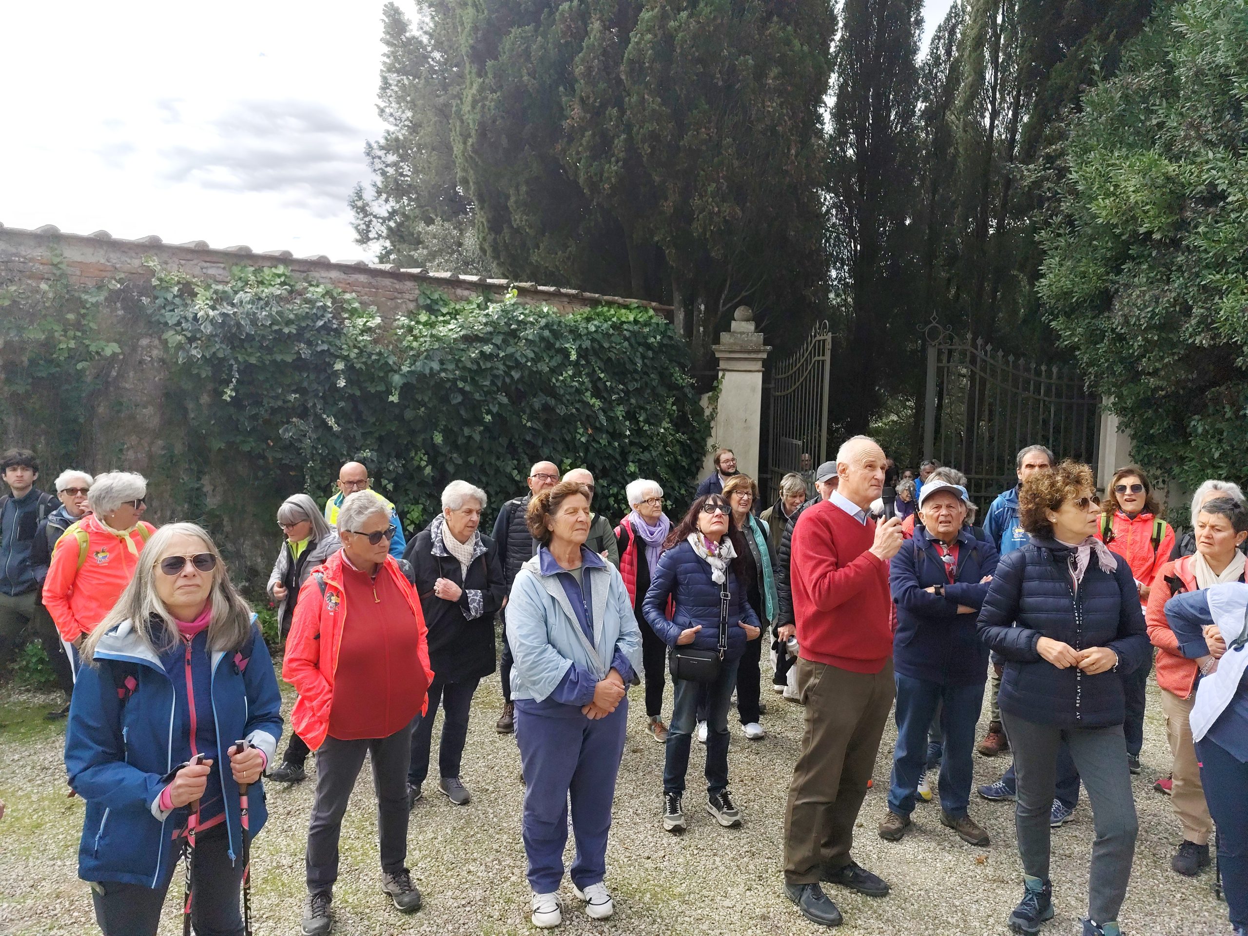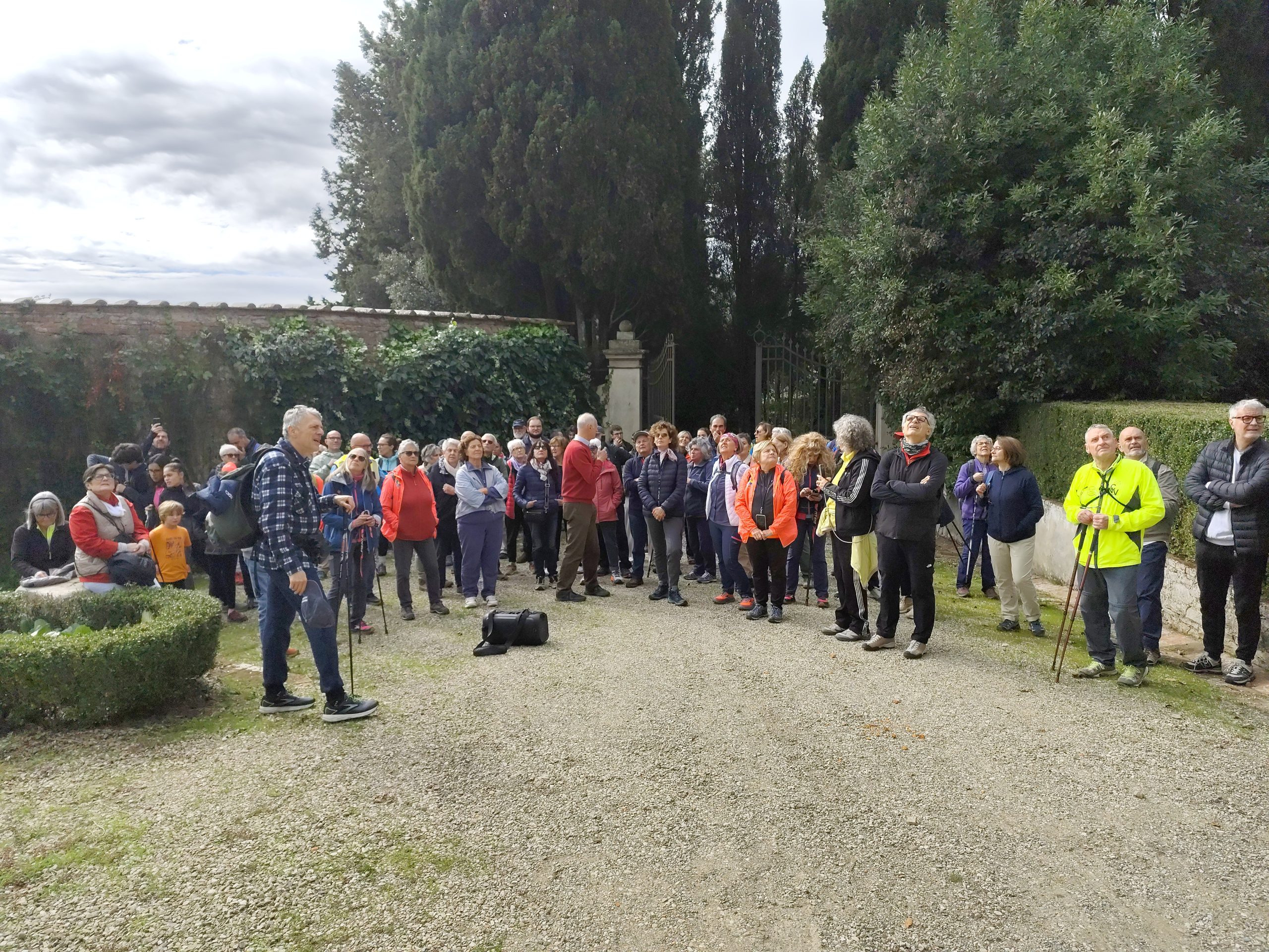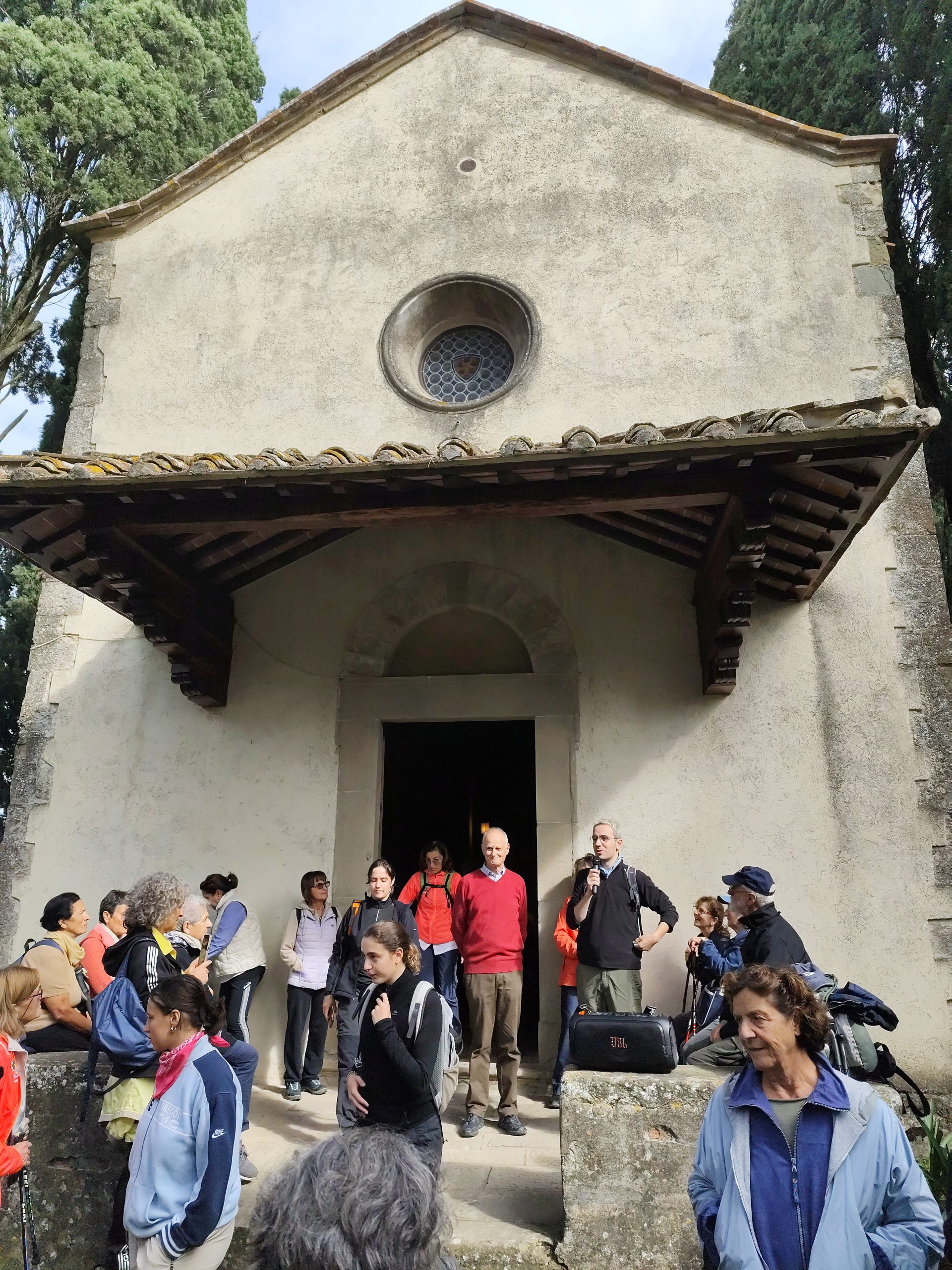 La visita è proseguita nei giardini della villa: all’ingresso il giardino all’italiana molto semplice, è stato rifatto nel 1937, attraverso il bellissimo pergolato che si trova nel lato est siamo passati al giardino sul retro, dal quale sia ha una magnifica visione della vallata. La villa del Trebbio al momento è oggetto di lavori di restauro. La passeggiata è terminata a Spugnole dove Francesco Calamai ha presentato la storia del territorio e della Chiesa che nasce intorno al IV, V secolo, poi divenuta chiesa castellana, oggi sotto la Pieve di San Piero a Sieve, ma un tempo sotto il piviere di San Giovanni in Petroio. La chiesa si presenta in ottime condizioni grazie ai lavori di restauro che termineranno entro la fine di questo mese.