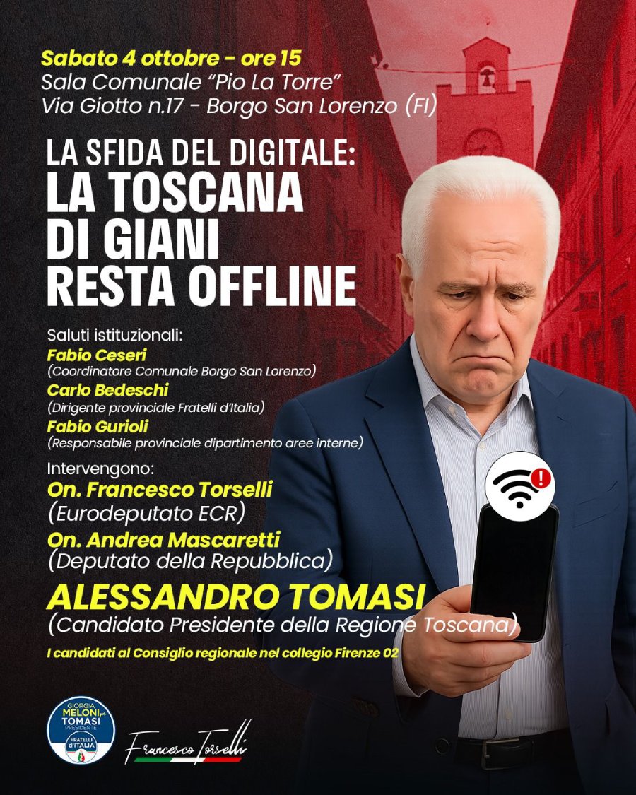 incontro organizzato da Fratelli d’Italia Mugello e dal titolo “La sfida del digitale: la Toscana di Giani resta offline”. L’evento si inserisce nell’ambito della campagna elettorale per le prossime elezioni regionali e intende aprire un confronto pubblico sul ritardo digitale della Regione Toscana, analizzando criticità, opportunità e soluzioni concrete per un futuro più connesso ed efficiente.