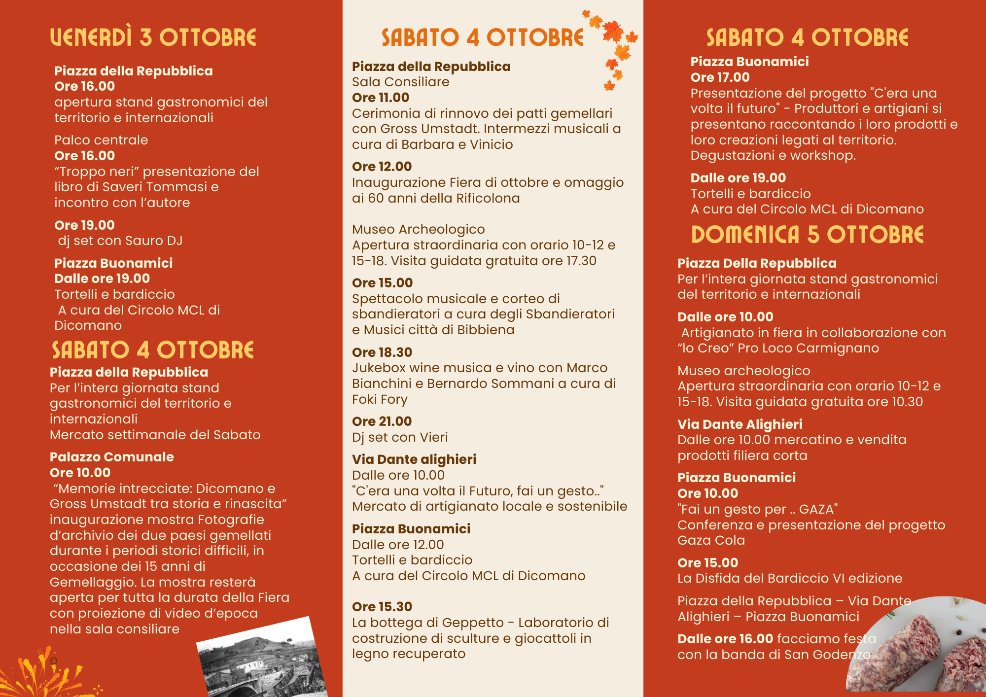 Da Piazza della Repubblica, la piazza dei sapori, con tante offerte gastronomiche per soddisfare tutti i gusti, il percorso si snoda lungo Via Dante Alighieri quest’anno dedicata a “C’era una volta il futuro” mostra mercato di agricoltura e artigianato sostenibile con tanti giovani produttori e artisti pronti a raccontare storie belle di amore per la propria terra. In Piazza Buonamici spazio alle attività per bambini e domenica tutti ad assaggiare il bardiccio per l’attesa sesta edizione della Disfida del Bardiccio con macellai della Valdisieve e del Mugello in gara insieme a chef molto speciali, pronti a contendersi l’ambito palio. Confermate le due prove quella sulla griglia e quella in cucina per la quale la giuria avrà modo di gustare e giudicare il miglior piatto a base di bardiccio, abbinato a vini del territorio.