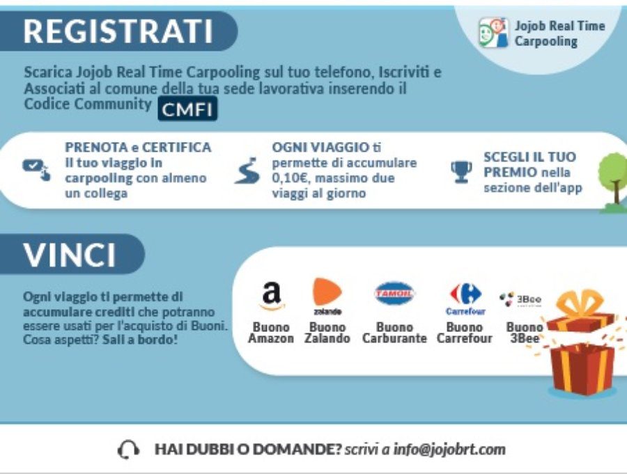 Per fare parte della Community Territoriale ogni utente dovrà inserire il codice CMFI (identificativo della Città metropolitana di Firenze) cliccando sul pulsante Community. Solo in questo modo si potrà avere accesso agli incentivi dedicati. Jojob si può utilizzare sia tutti i giorni che in caso di imprevisto o necessità (sciopero dei mezzi pubblici, indisponibilità dell’auto). Si potranno gestire agenda personale, organizzare e pubblicare viaggi in carpooling, offrire un passaggio mettendo a disposizione la propria auto o trovare un passaggio grazie agli autisti che si metteranno a disposizione per condividere il viaggio con chi lo richiede; gestire, volendo, il pagamento dei viaggi tramite l’app; comunicare con il proprio equipaggio tramite la chat integrata; fare del bene all’ambiente e ricevere l’incentivo per ogni viaggio in carpooling.