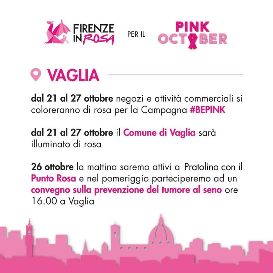 L’iniziativa è inserita nel “Pink October” della onlus “Firenze in rosa”, nell’ambito della quale per tutta la settimana dal 21 al 27 Ottobre il Municipio di Vaglia è stato illuminato di rosa.