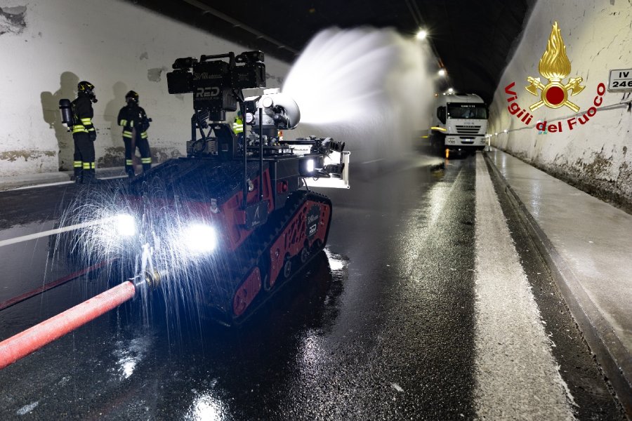 Nella seconda fase dell’esercitazione (l’incendio in galleria) sono stati testati i due robot cingolati antincendio “Shark Colossus” insieme al nuovo mezzo APS (Auto Pompa Serbatoio), impiegati entrambi nelle operazioni di spegnimento, concessi in comodato d’uso al comando di Firenze da Autostrade per l’Italia. L’esercitazione si è conclusa alle ore 23:30.